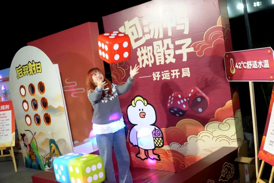 在杭州滨江银泰,“泡汤鸭”带来了一座“鸭鸭运动场”。年轻人们踩着“热力踩泉”,玩着“愤怒泡汤鸭”,在运动游戏中释放压力,也在打卡集章中领取温暖——原来,疗愈可以这么动感,这么年轻。