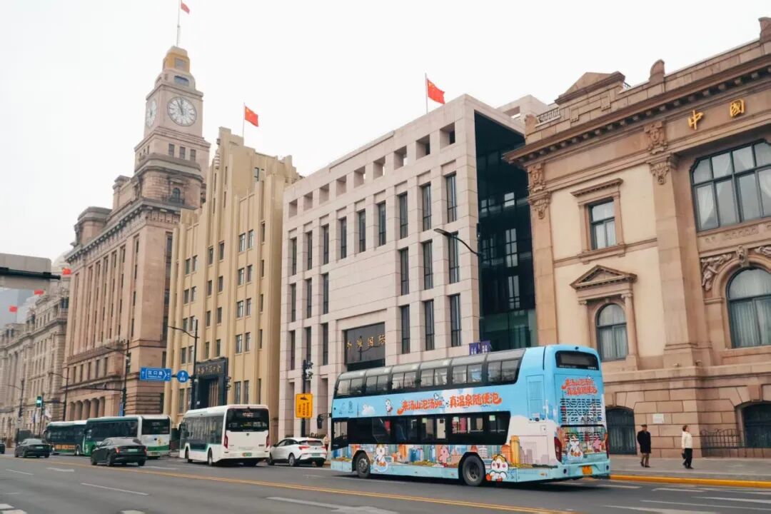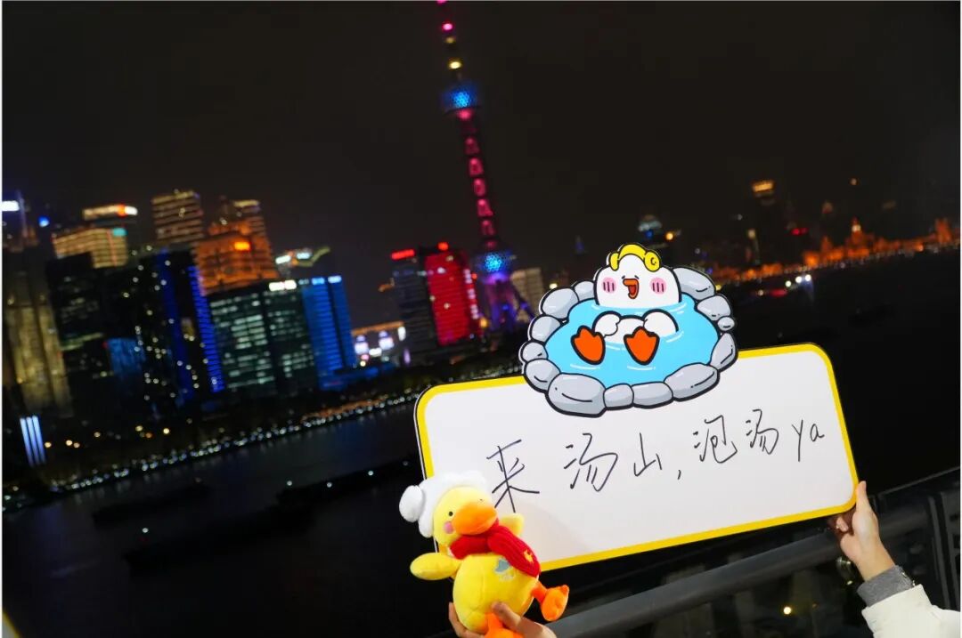 在上海,汤山开来了一辆 “移动美学巴士”。车身绘着温泉波纹与憨萌的“泡汤鸭”,穿行于外滩、上海老城之间,成为一道流动的城市诗行。