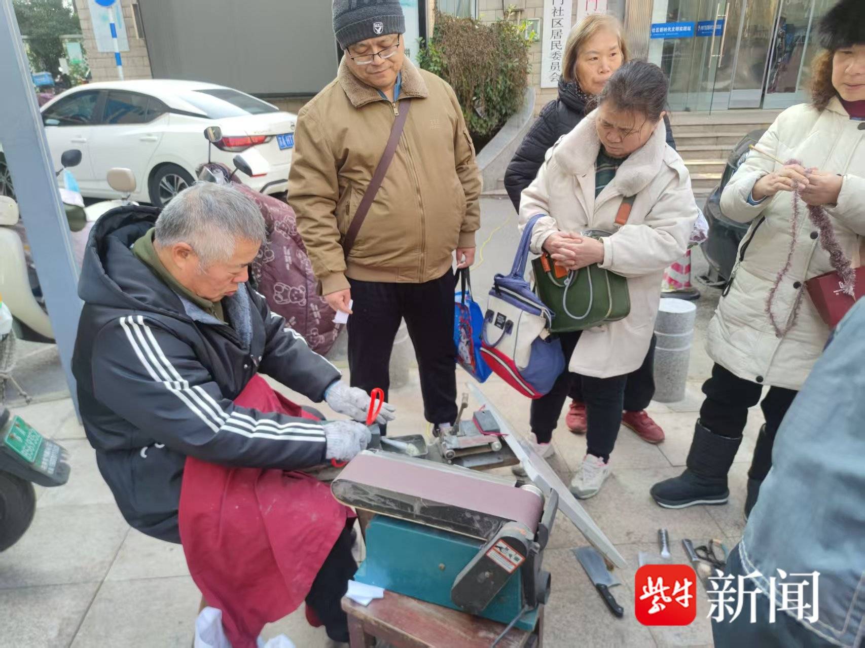 下午2时,尽管天气寒冷,来自南京金陵商会、南京星火公益发展中心便民服务团、建邺区群心社会工作发展中心等组织的志愿者们早已就位,带来了磨刀、理发、修伞、补鞋等备受居民欢迎的“老行当”服务。居民们闻讯而来,带着用钝的菜刀、开胶的鞋子、损坏的雨伞,在广场上有序排队等候。“快过年了,社区把这么实用的服务送到家门口,想得真周到!”居民倪师傅的感慨,道出了大家的心声。