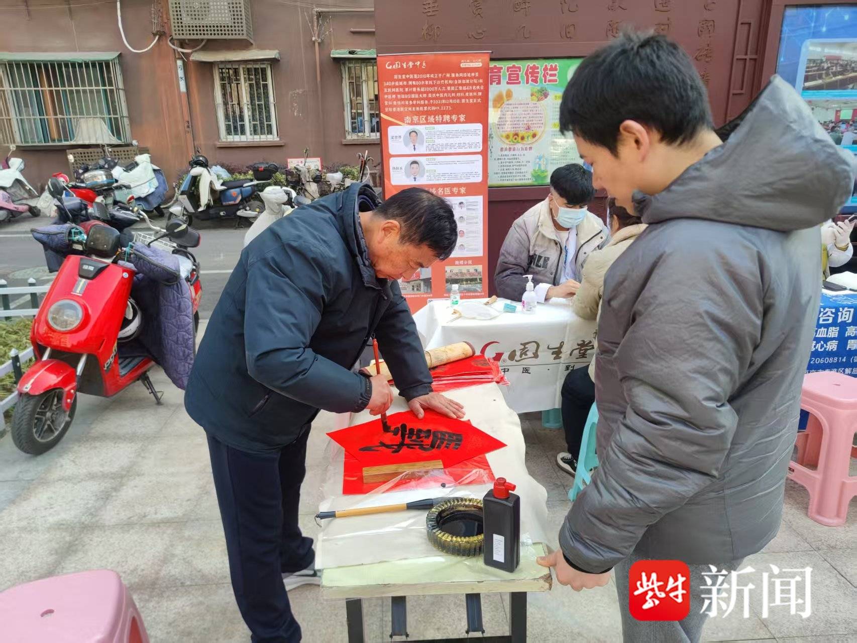 活动现场墨香阵阵,年味浓浓。南京市莫愁湖书画联谊会的书法家们挥毫泼墨,一副副春联、一张张“福”字承载着祝福递到居民手中。此外,南京华厦眼科医院、固生堂中医院、德牙口腔医院等医疗机构为居民提供了眼科检查、血压血糖测量、口腔健康咨询等专业服务;中国移动的免费贴膜服务也吸引了众多居民。多样化的便民举措,让这个冬日午后暖意融融。