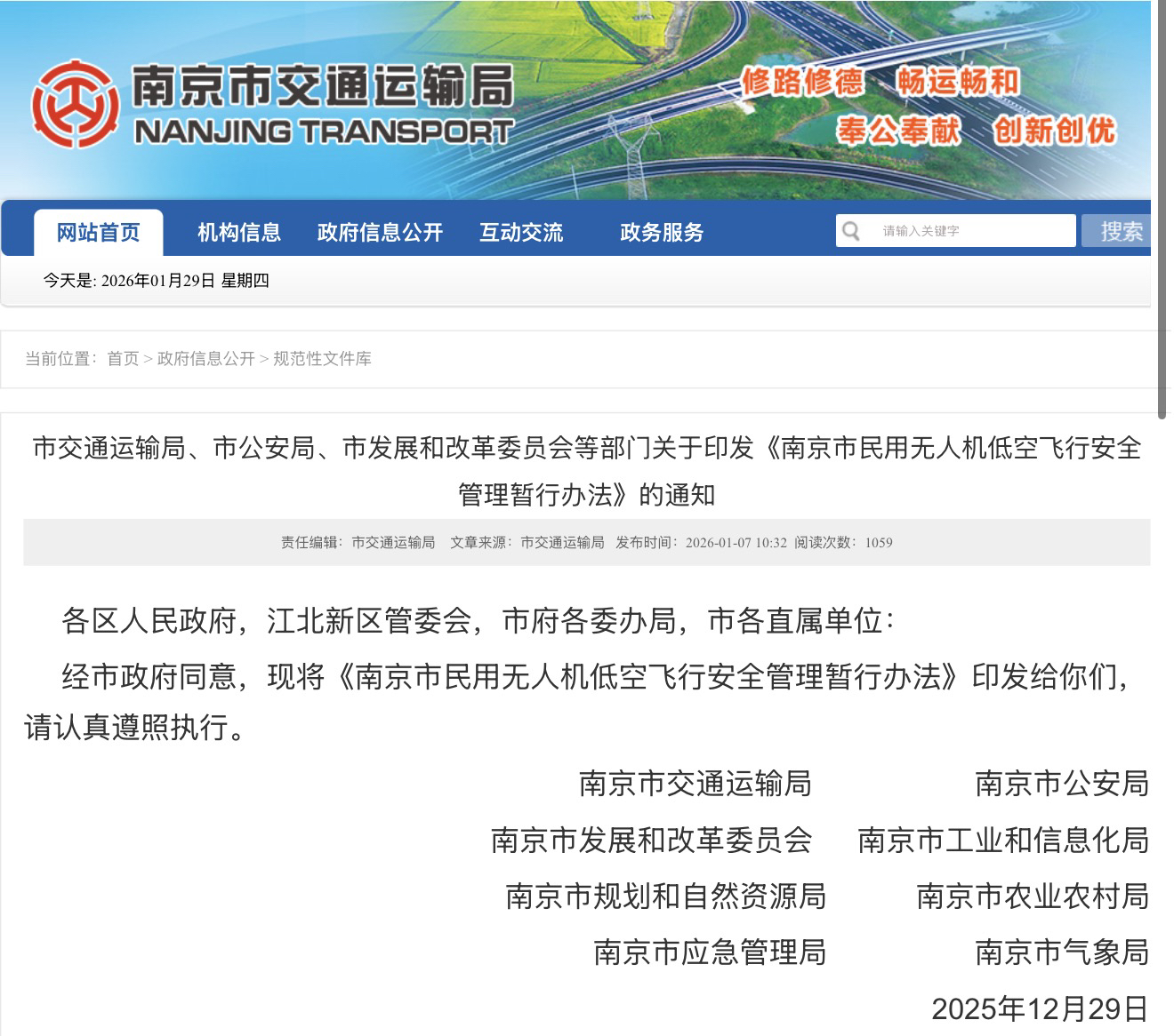 为引导广大飞行用户更好地“安全飞”,保障低空经济安全健康发展,近期,南京市交通运输局、市公安局、市发展和改革委员会等八个部门联合印发《南京市民用无人机低空飞行安全管理暂行办法》(以下简称《办法》),该办法将于2026年2月1日起正式施行,有效期至2028年1月31日。新规清晰划定了11类违规飞行行为,构建了全流程的安全管理体系,还可依托专属平台和小程序为飞行用户提供便捷服务。