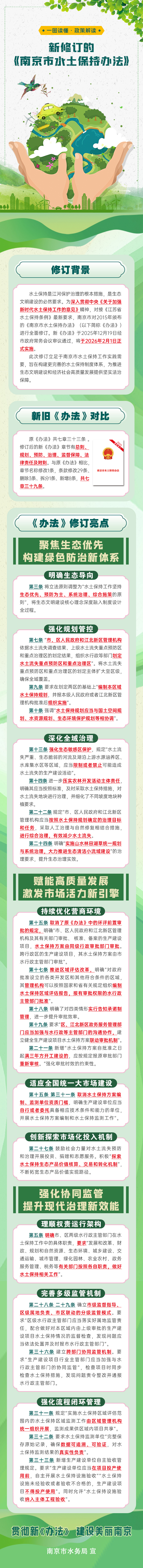 水土保持是江河保护治理的根本措施,是生态文明建设的必然要求。为深入贯彻中央《关于加强新时代水土保持工作的意见》精神,对接《江苏省水土保持条例》最新要求,南京市对2015年颁布的《南京市水土保持办法》进行全面修订。此次修订立足于南京市水土保持工作实践需要,旨在构建更完善的水土保持制度体系,为推进生态文明建设和经济社会高质量发展提供坚实法治保障。
