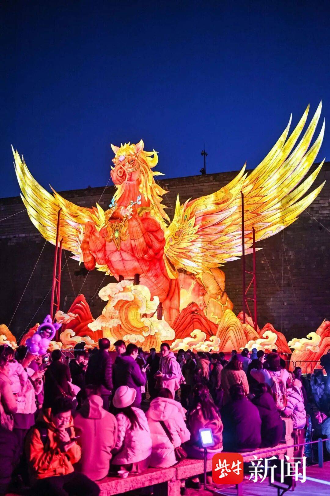 中华门城墙新春游园会以“飞马踏云”为设计理念,让游人在古城墙的历史文化底蕴中感受年节喜气。江北新区桥北商圈分会场在长江大桥江北主入口及商圈核心区域布设大型灯组,营造“灯映北岸、年味满城”的氛围。
