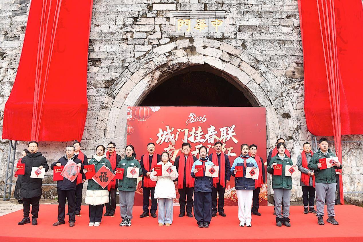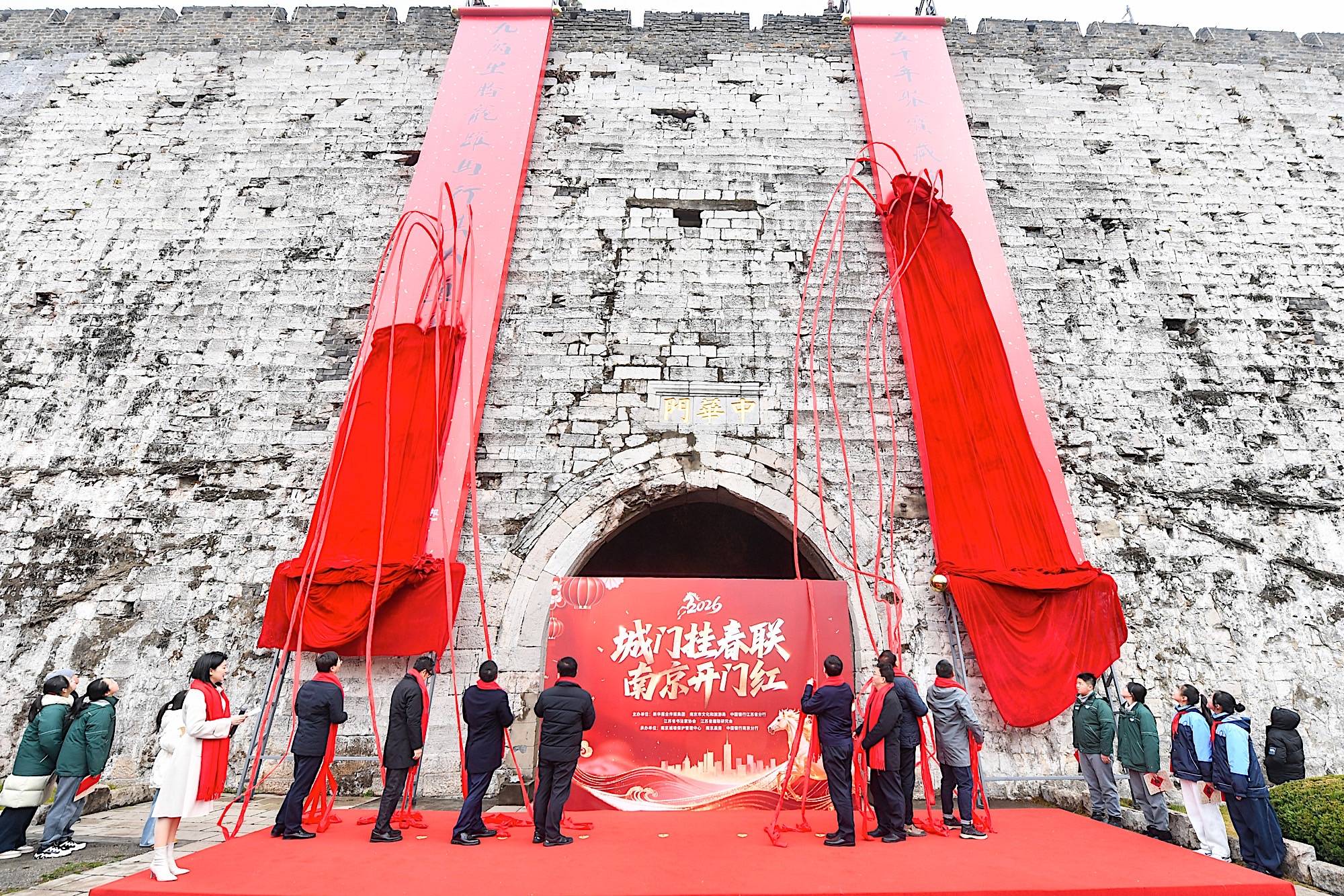“五千年聚宝藏珍,耀我中华,频开盛世;九万里腾龙跃马,行其大道,再展雄风。”一副长十五米、宽两米的巨幅大红春联于1月31日上午在南京中华门瓮城震撼亮相,正式拉开丙午马年新春序幕。由新华报业传媒集团、南京市文化和旅游局、中国银行江苏省分行、江苏省书法家协会、江苏省楹联研究会联合主办,南京城墙保护管理中心、南京晨报、中国银行南京分行共同承办的2026年第十一季“城门挂春联 南京开门红”揭联仪式,在中华门隆重举行。