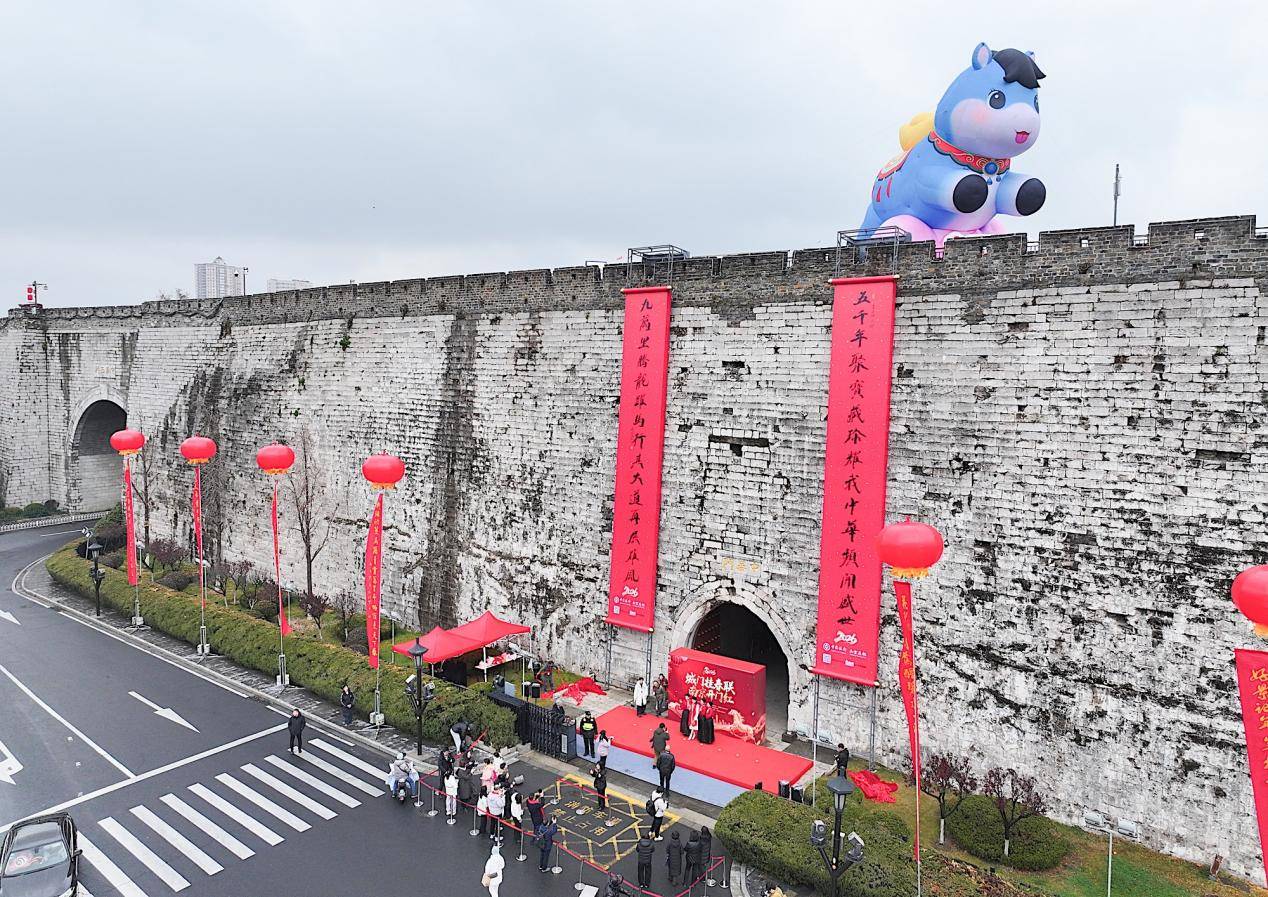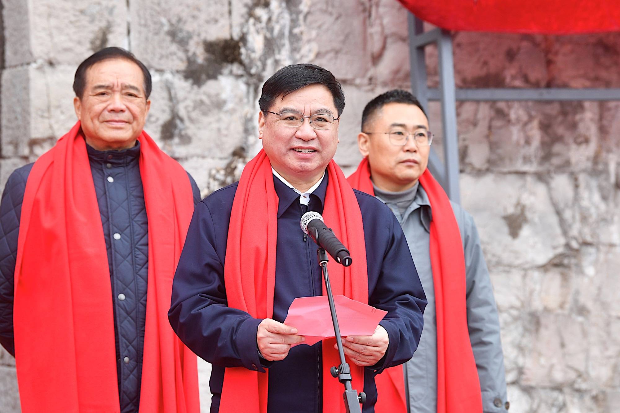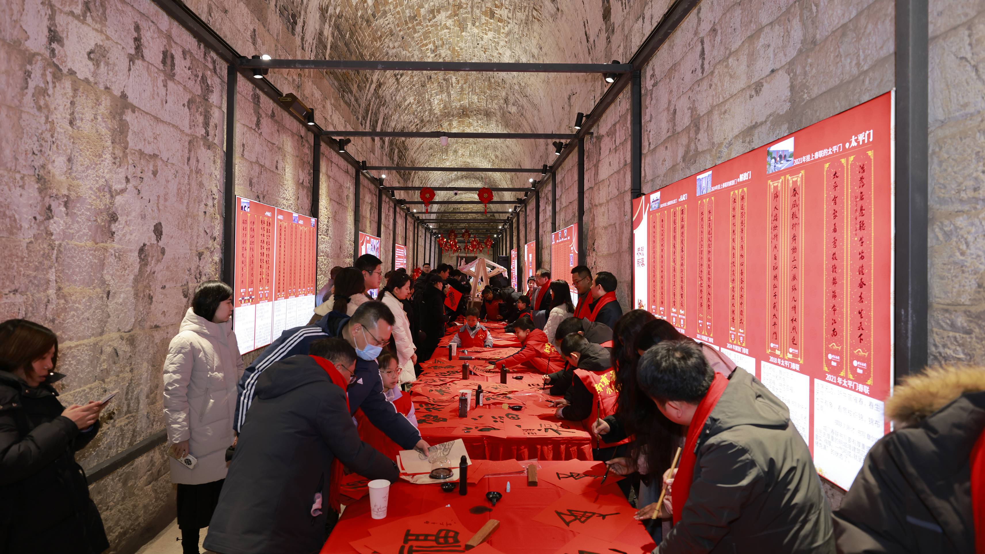 2024年,“春节——中国人庆祝传统新年的社会实践”被列入人类非物质文化遗产代表作名录,成为世界普遍接受、认同和欣赏的中华文化符号。“城门挂春联 南京开门红”活动,创造性地将660岁的物质文化遗产明城墙,和传承千年的书法、楹联、春节民俗等非物质文化遗产完美融合在一起,正是南京一年一度迎接春节的生动实践。活动现场,省、市及相关部门领导共启红绸,共同揭开了中华门巨幅春联的真容。
