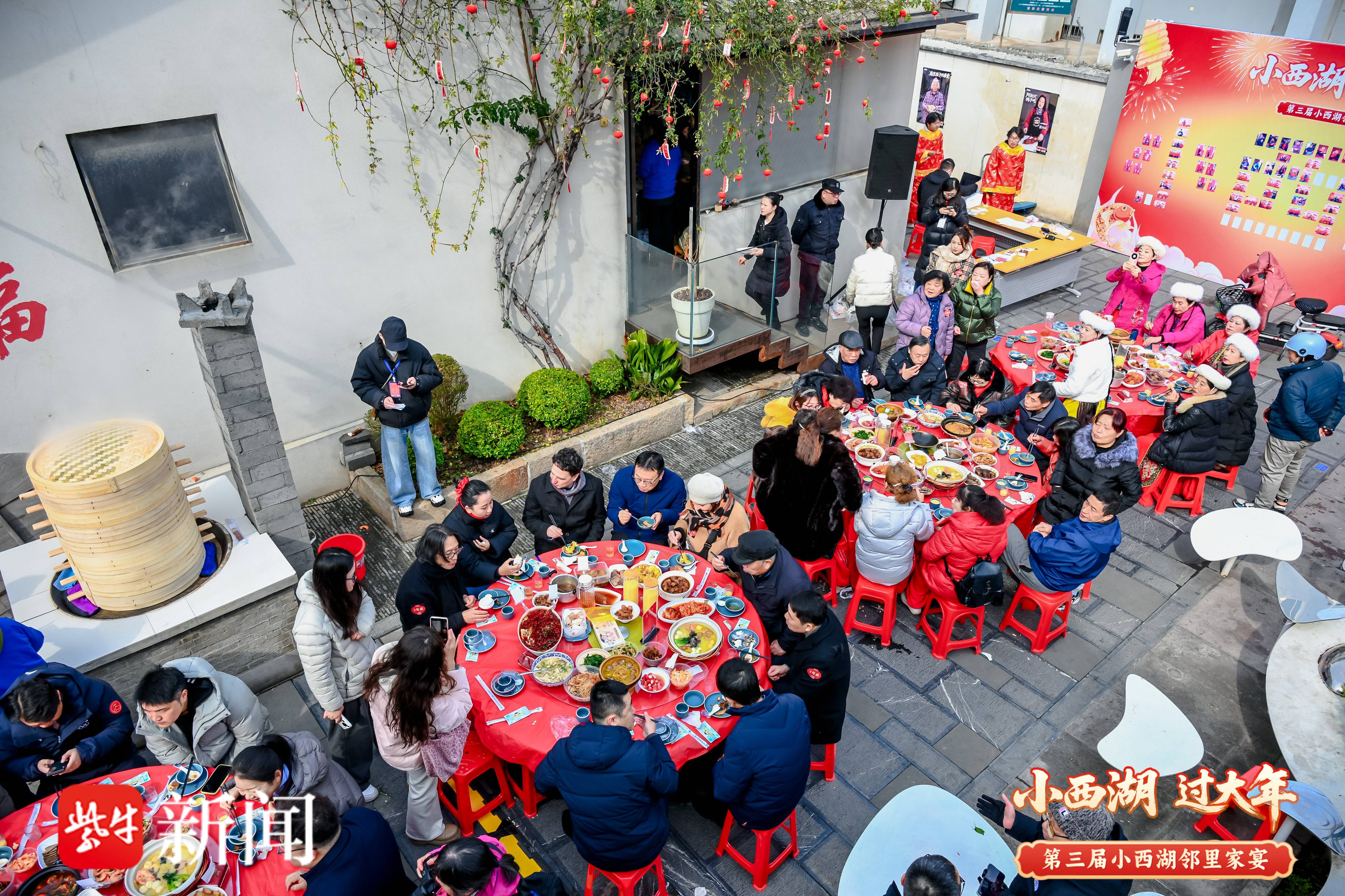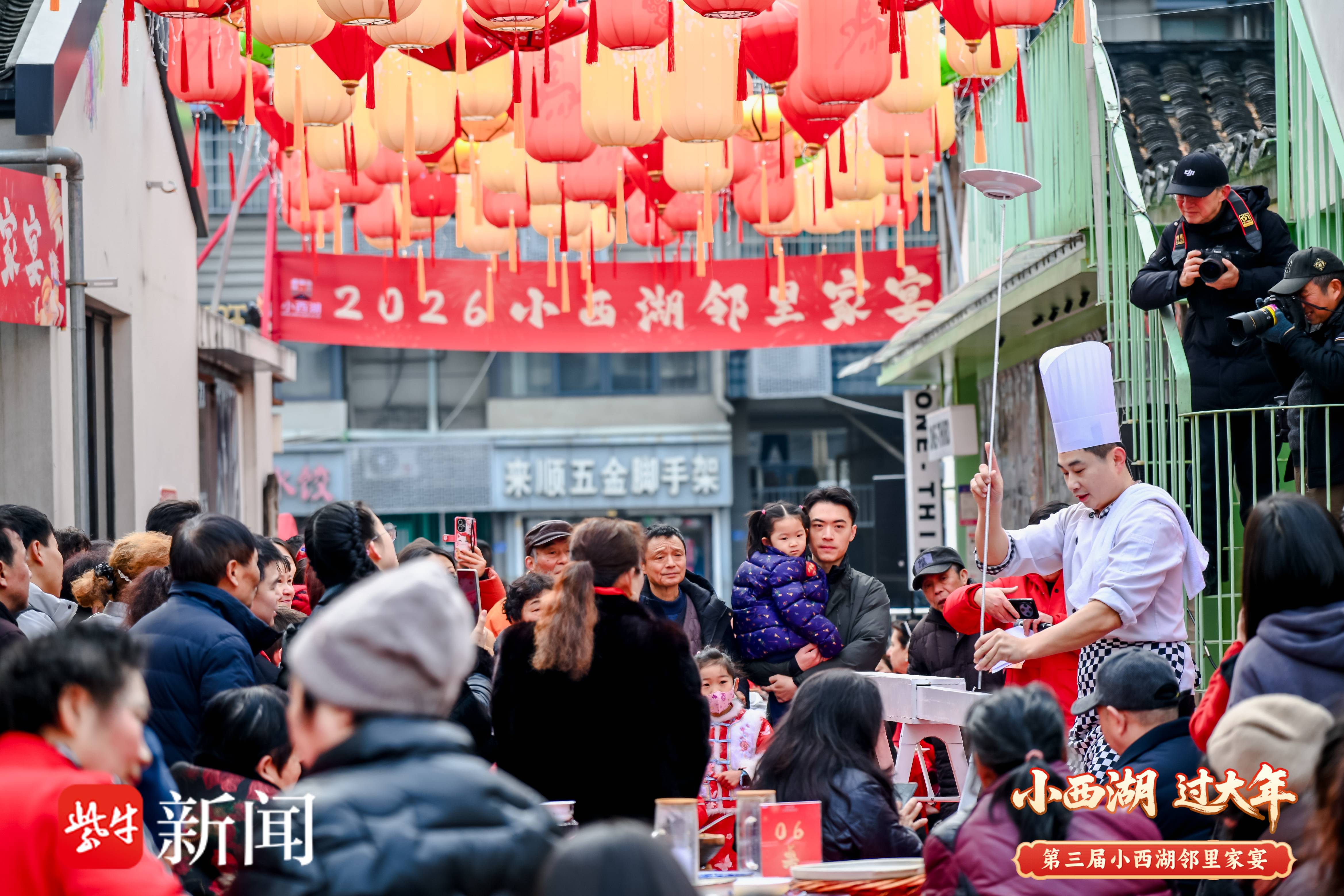2月1日中午,南京小西湖街区12张铺着红桌布的中式圆桌一字排开,热气腾腾的“邻里家宴”准时开席。这是小西湖老城街巷焕新后,连续第三年举办的街坊团圆宴。这场原本根植于老街巷温情的聚会,今年却意外吸引了不少外国面孔前来打卡,飘出了浓郁的国际味道。
