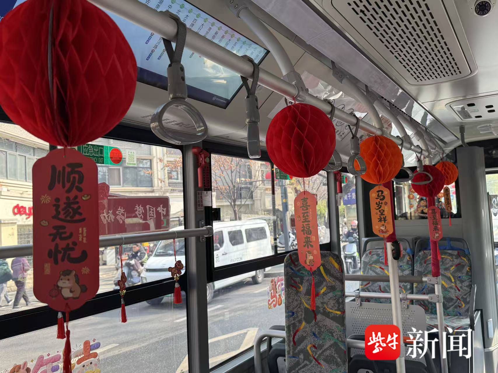 走进两辆“劳模工匠号”,浓厚的奋斗气息与新春暖意扑面而来。车头醒目的“劳模工匠号”贴纸熠熠生辉,成为城市道路上的移动标杆;两侧车窗张贴的“美好生活都是靠劳动创造出来的”“光荣属于劳动者 幸福属于劳动者”等激励标语,既彰显了劳动光荣的价值导向,也传递着奋进向上的正能量。车厢内,“马年大吉”字样的可爱窗花、“新年快乐”字样的精致门联、悬挂的小灯笼与灵动的小马挂件相映成趣,将公交车厢装扮成温馨的新春驿站,提前营造出喜庆祥和的节日氛围。