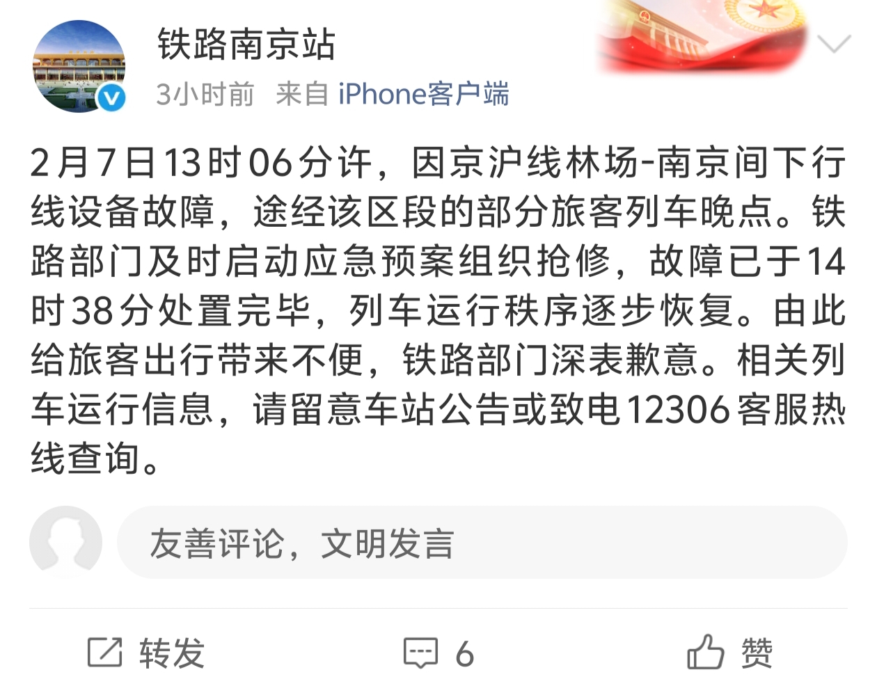 2月7日13时06分许,因京沪线林场-南京间下行线设备故障,途经该区段的部分旅客列车晚点。铁路部门及时启动应急预案组织抢修,故障已于14时38分处置完毕,列车运行秩序逐步恢复。由此给旅客出行带来不便,铁路部门深表歉意。相关列车运行信息,请留意车站公告或致电12306客服热线查询。