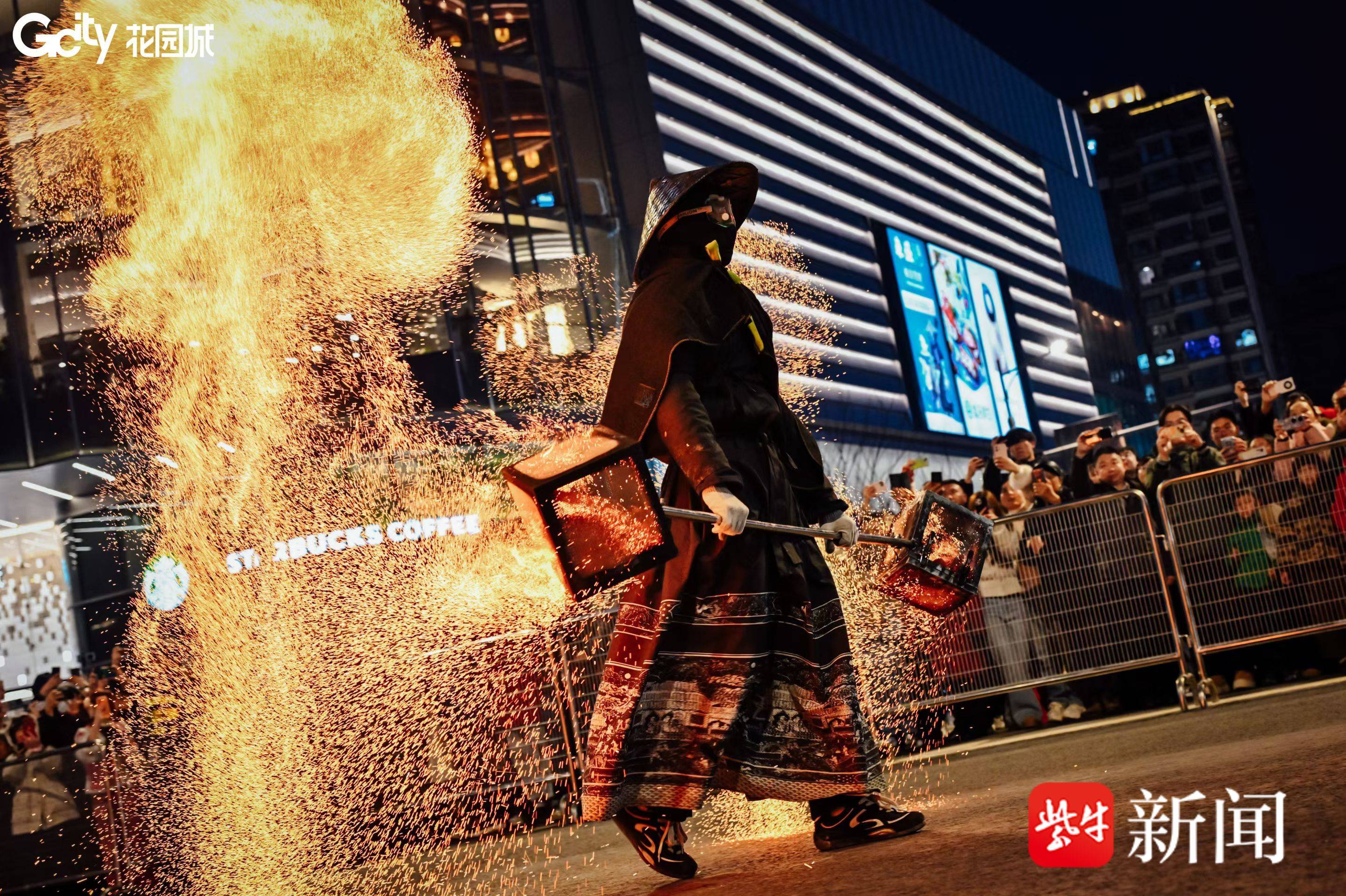 傍晚时分,夜幕初垂,人群已在玄武花园城核心区域聚集。忽然,锣声一转,节奏变得激昂,数位表演者手持特制燃炭铁壶跃至场中。