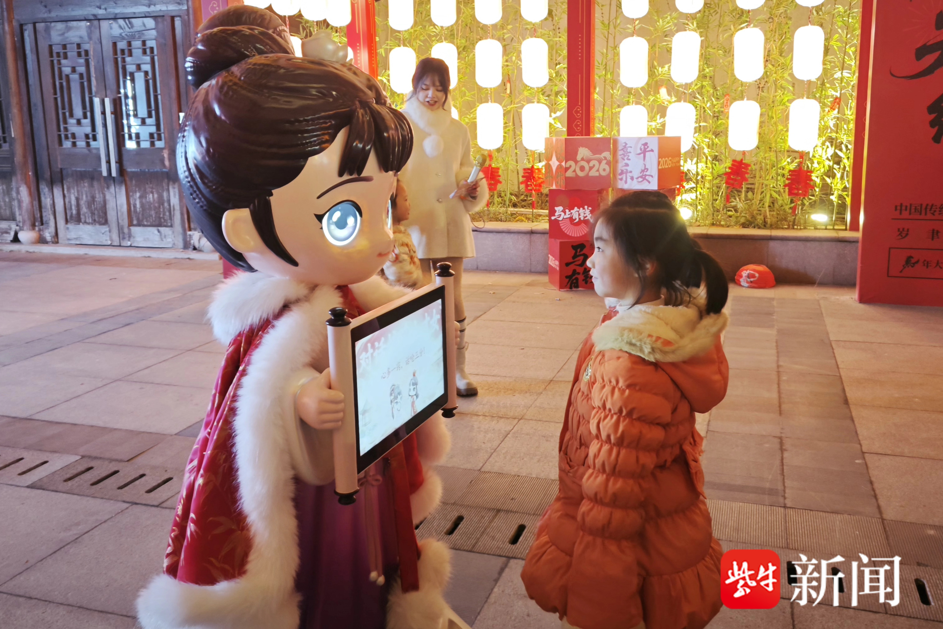 2月10日晚,扬子晚报/紫牛新闻记者刚走到“大梦·红楼”沉浸式展演空间入口,便听到一阵充满童趣的对话:“你能给我唱首歌吗?”“当然可以!我给小朋友们唱一首《两只老虎》吧,两只老虎,两只老虎……”原来,是“AI机器人黛玉”正与两位小观众围坐对谈、斗诗互动。