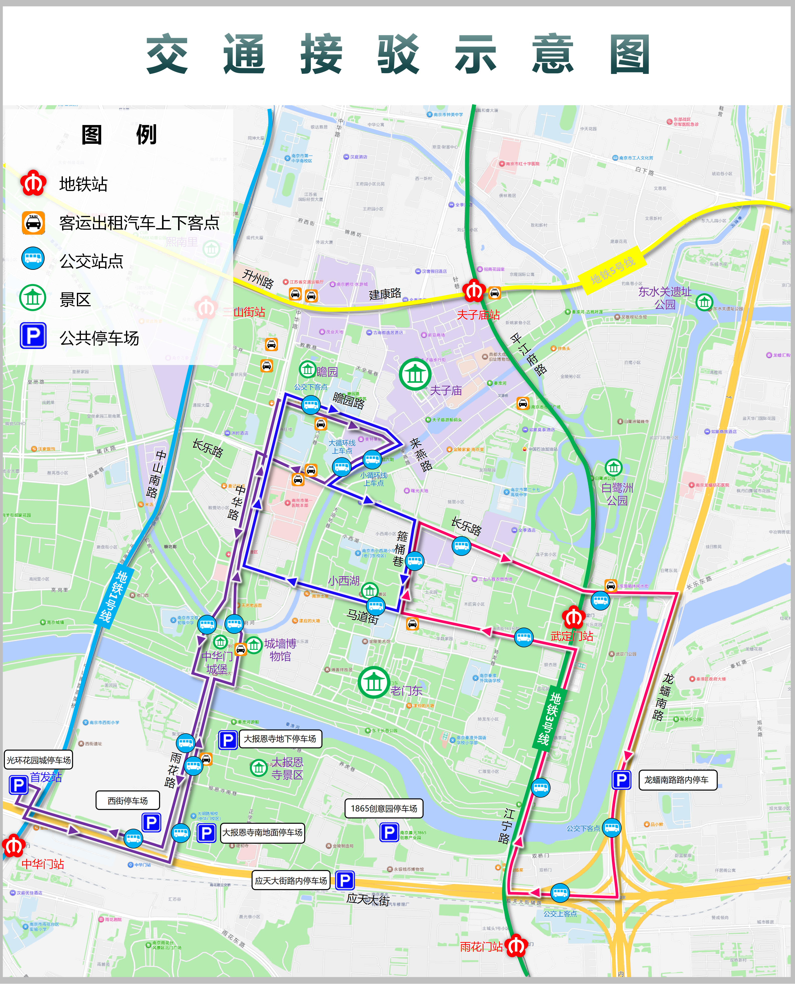 游客自驾外围停放:景区周边停车位极度紧张。自驾游客建议导航至地铁1号线中华门站对面(东环花园城停车场、西街停车场)可换乘接驳公交G1路;至地铁3号线卡子门站附近宜家、紫云智慧广场,大明路站附近中华城停车场,可换乘地铁3号线至武定门站(白鹭洲公园、老门东)、夫子庙站(夫子庙东牌坊附近)。