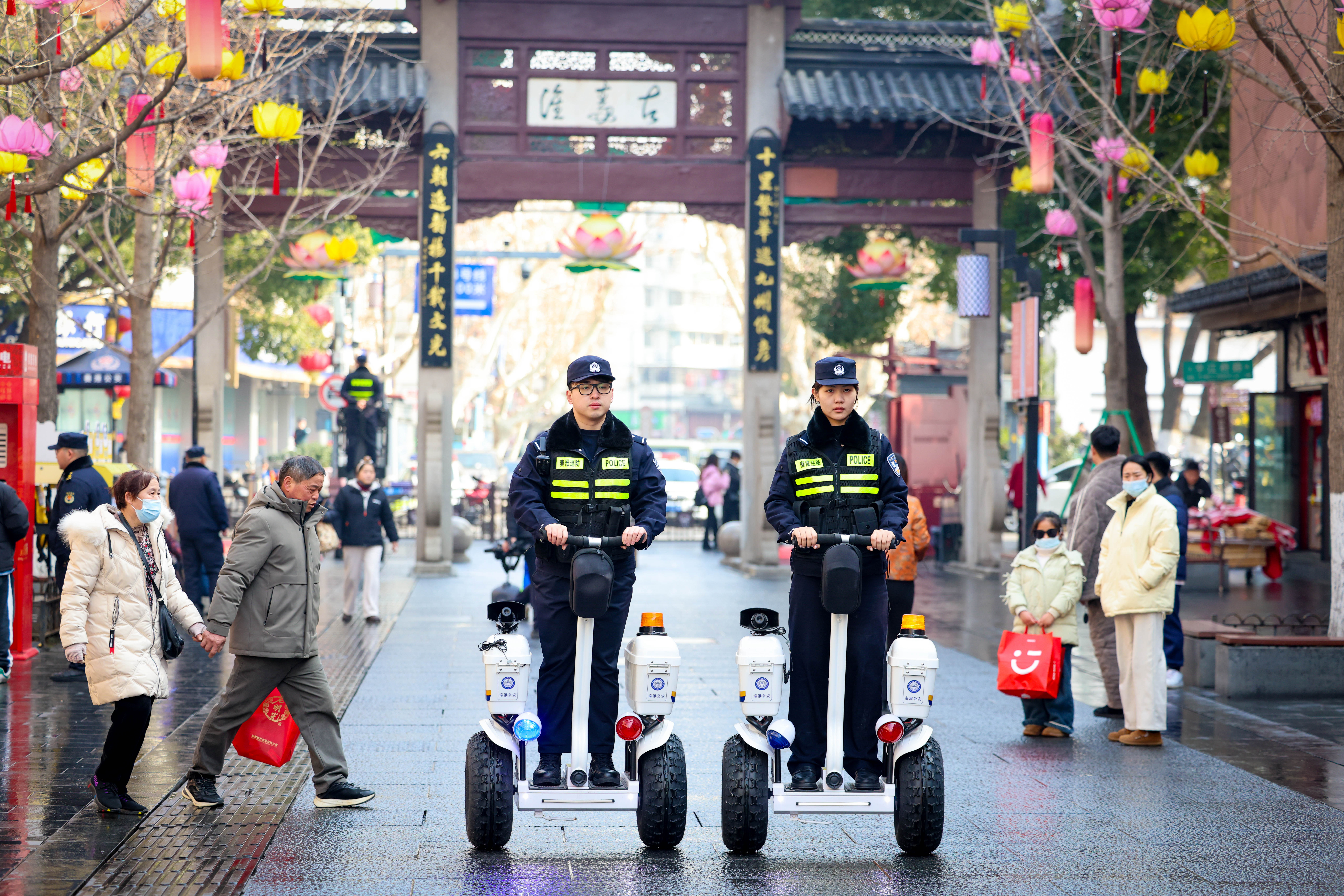 秦淮分局民警用平衡车在夫子庙景区巡逻,守护景区良好秩序。 拍摄:宁宫新