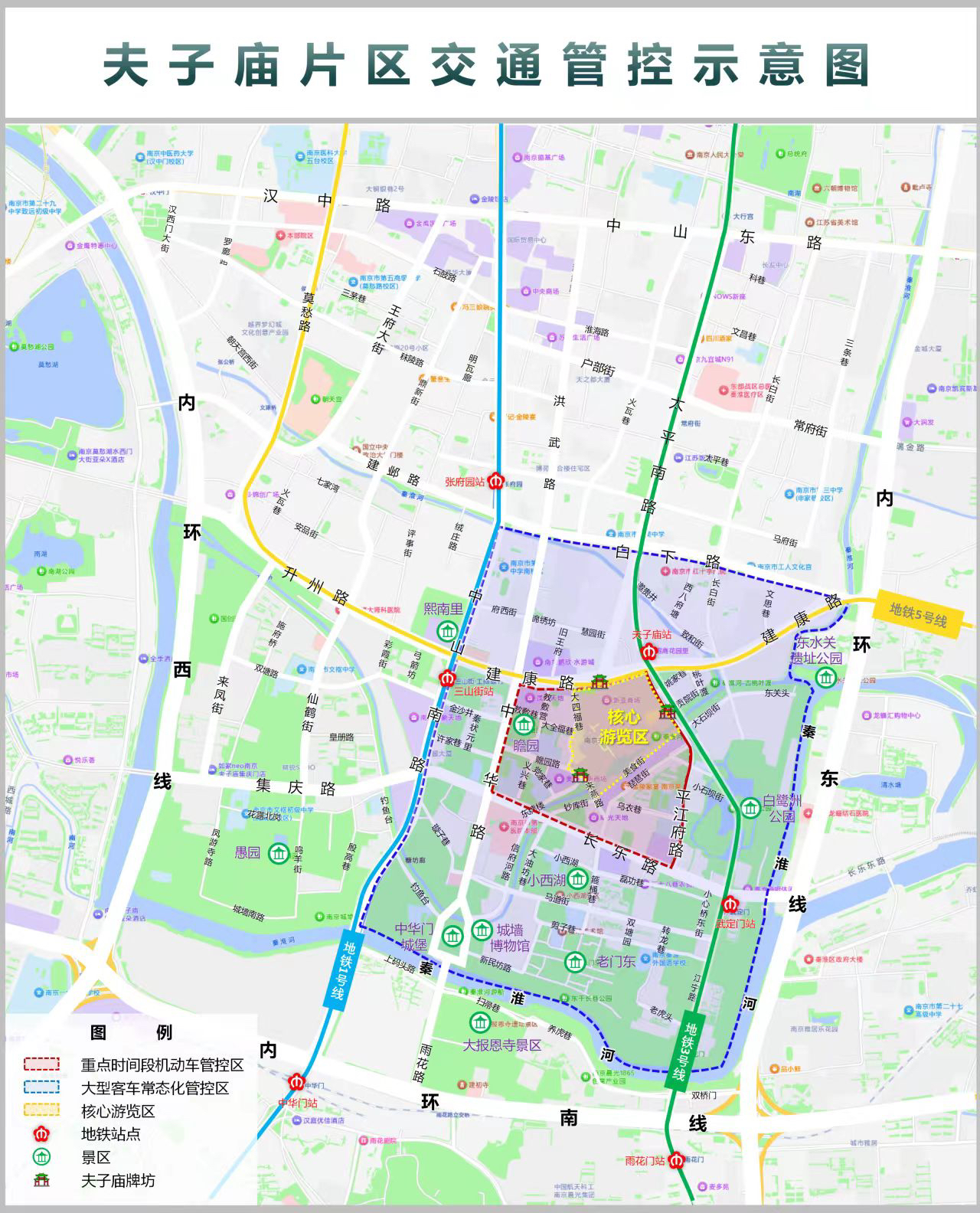 自2月15日起,夫子庙片区交通优化提升措施正式启动。建康路、中华路、长乐路、平江府路合围区域内(含平江府路)将在管控时段内禁止机动车驶入,公交车、景区接驳车辆还有区域内单位居民报备车辆除外。建议游客首选公共交通出行更方便。