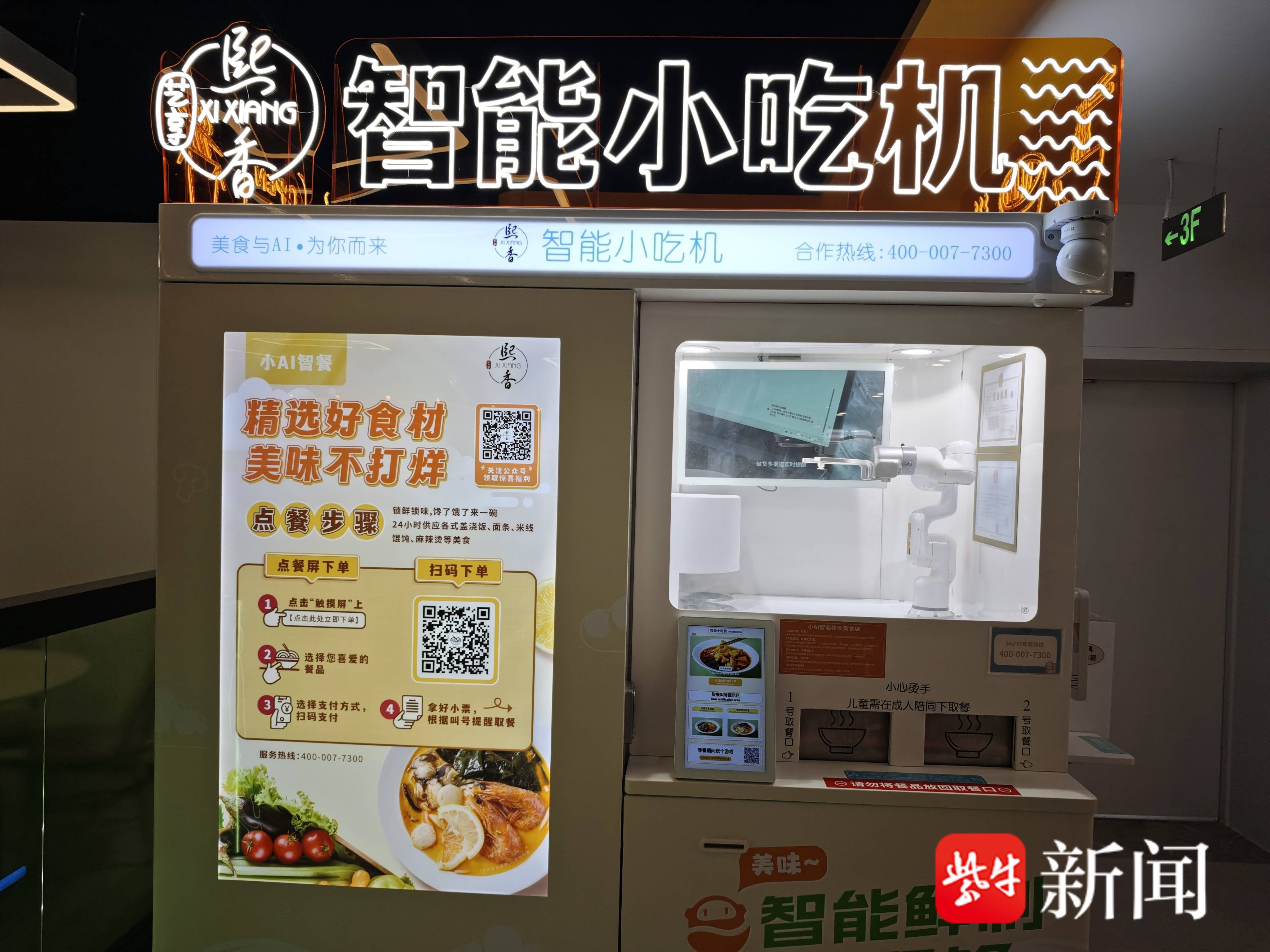 这家AI餐厅位于汇智城F座3层,进口处放置着一台24小时智能小吃机,提供盖浇饭、面条、馄饨、米线、麻辣烫等20多种小吃,价格在20元以内。