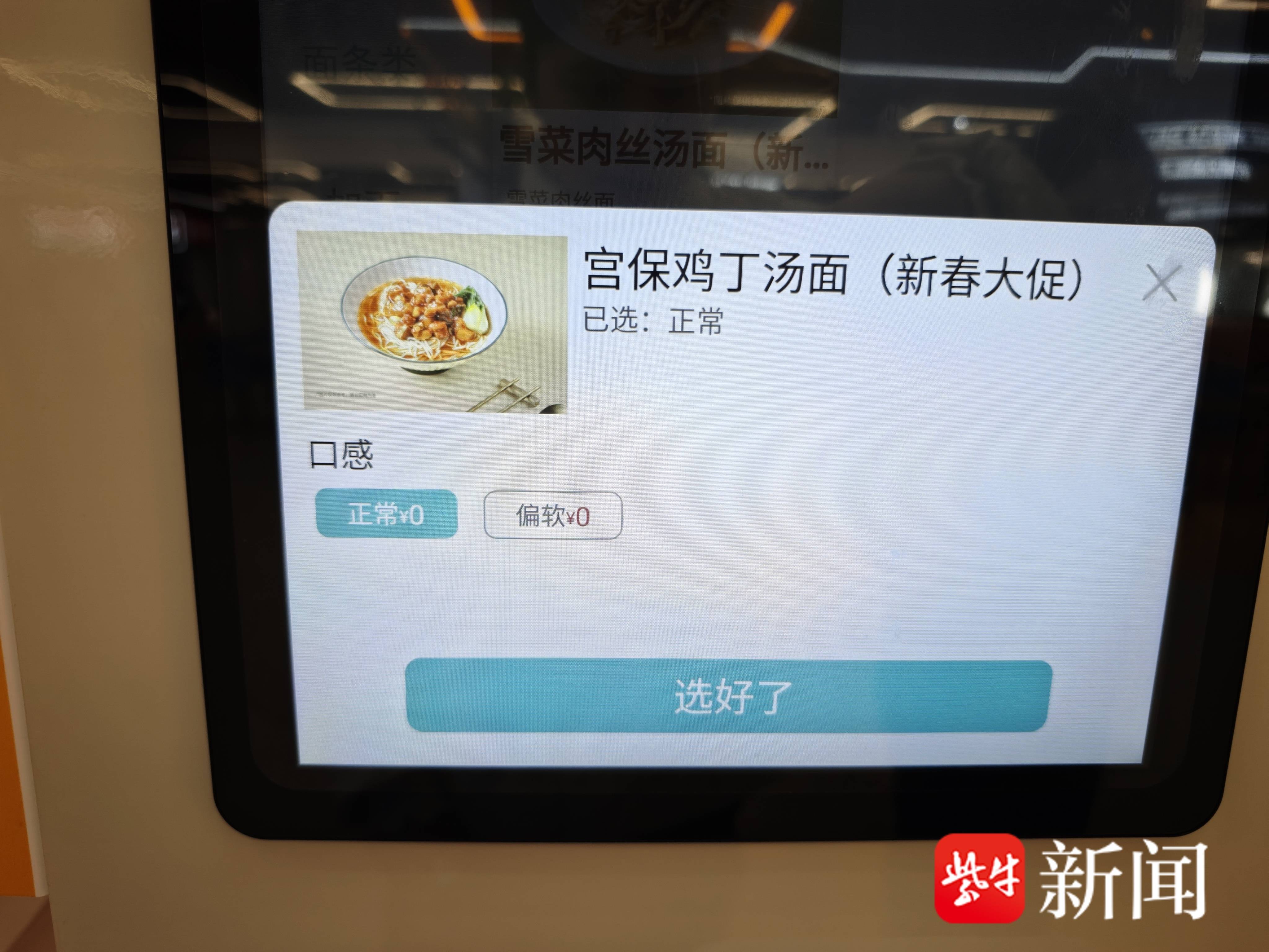 随后,记者来到点餐机,面条一共有宫保鸡丁汤面、红油辣肉沫面、雪菜肉丝汤面三种面条,都是9.9元,加面为3元。还可以选择口感,正常或者偏软。在智能面馆里,记者通过明厨亮灶看到两个黄色的机器臂分别负责浇头和面条。“这台设备可以一次性下3碗面条,从揉面到面条上桌大概耗时3分45秒,软的面条会多煮30秒左右。”工作人员告诉记者。