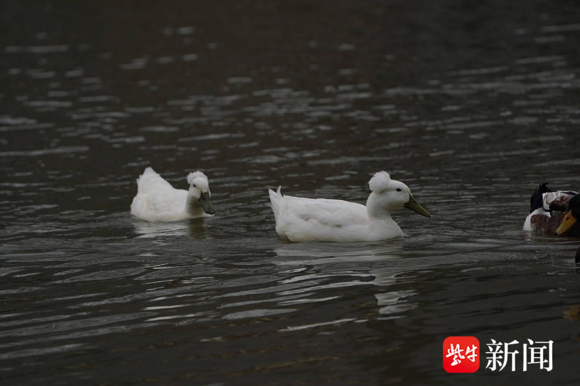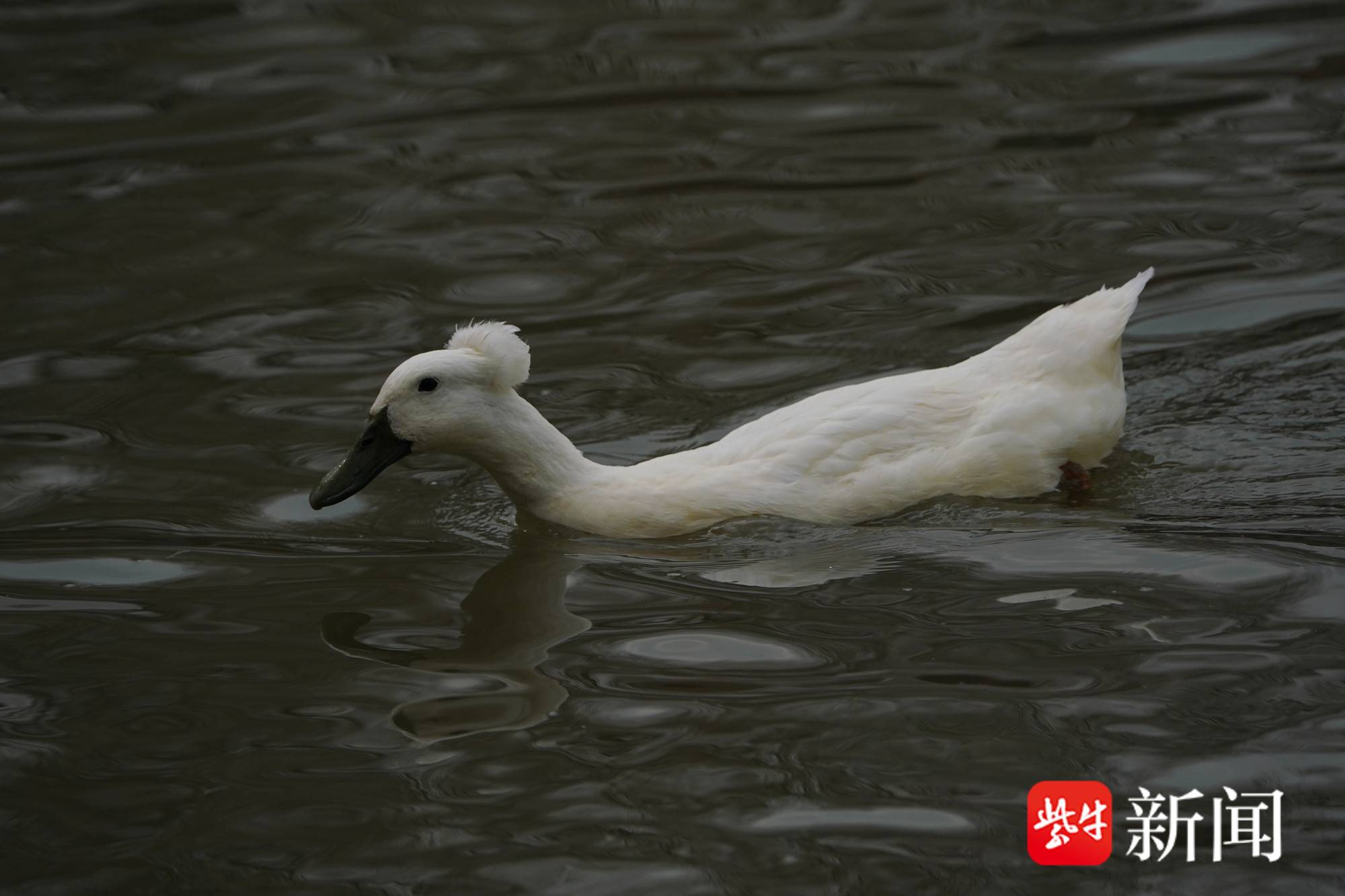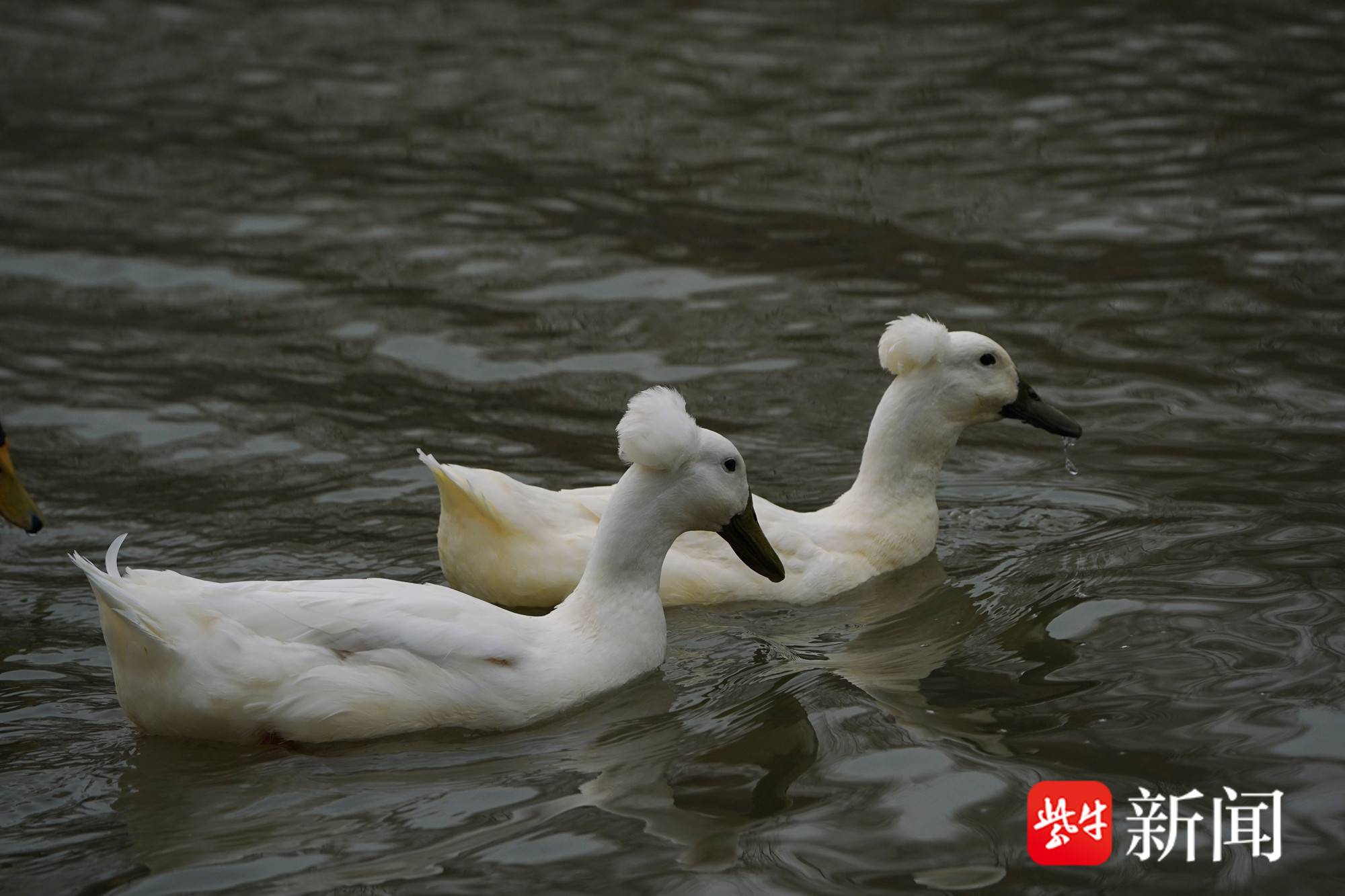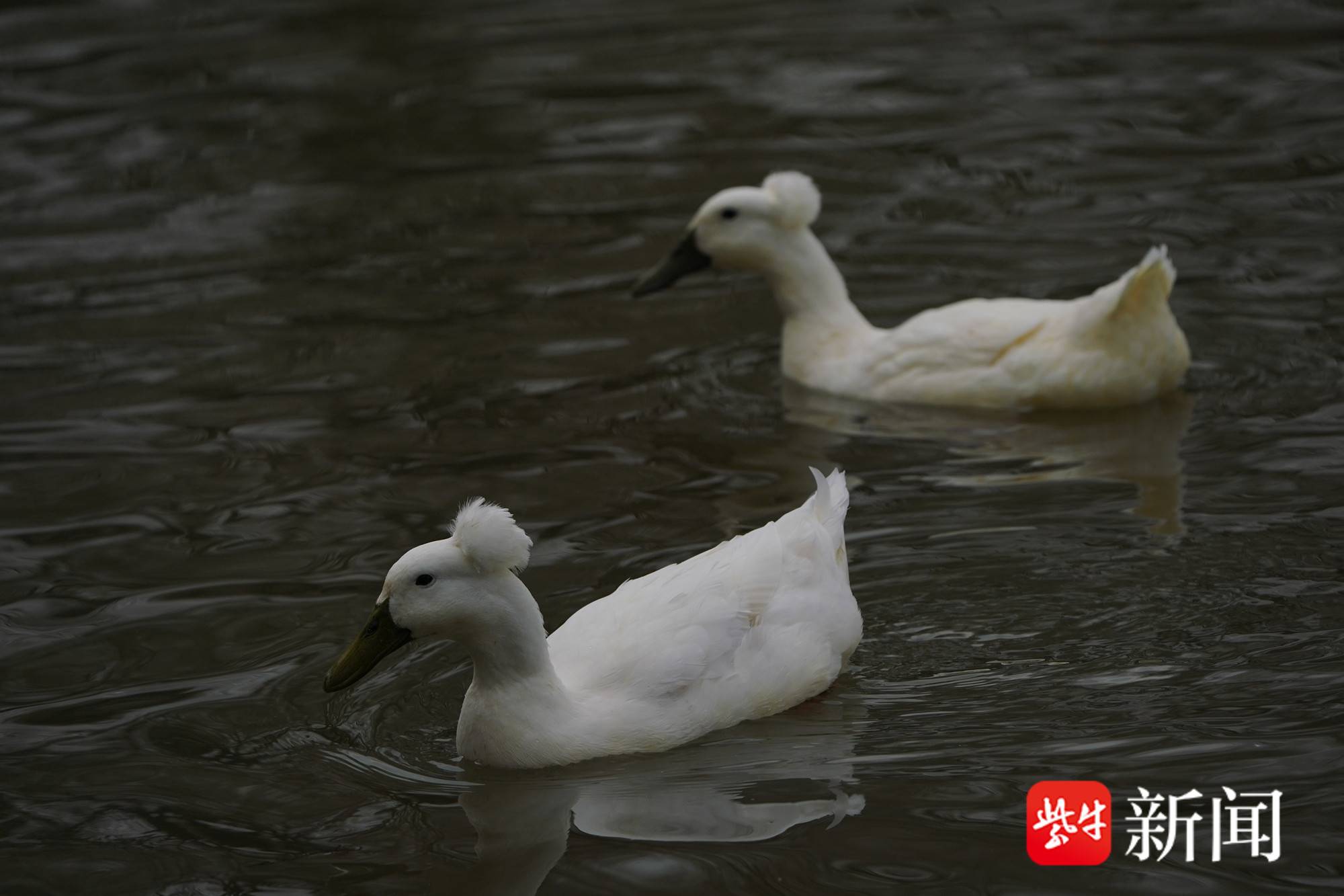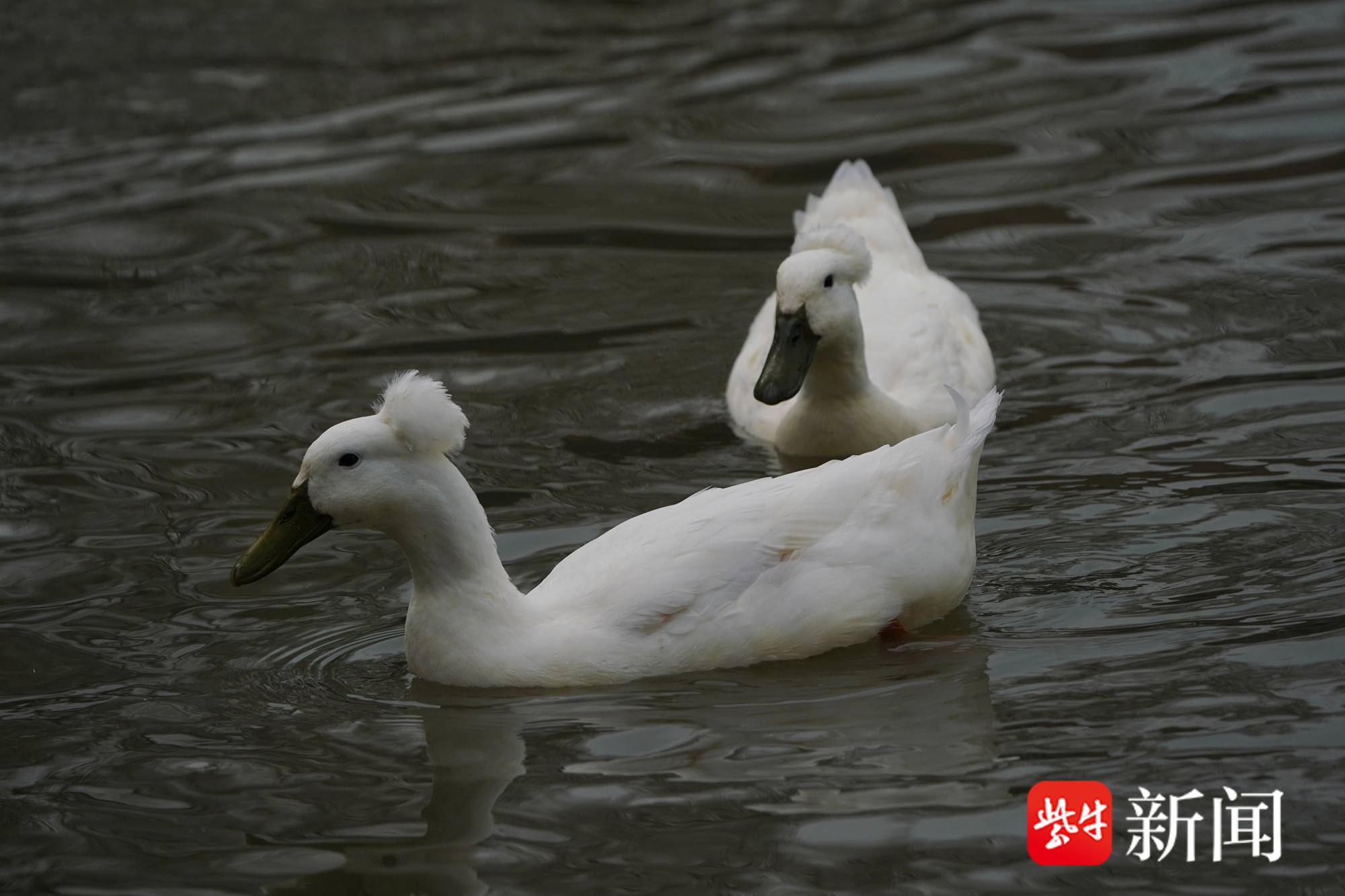 在南京绿博园的一片水塘里,两只凤头白鸭已适应这里的水环境。寒风中,两只凤头白鸭在欢乐戏水,它们仿佛顶着“爆炸头”,其“头发”茂密,让人怀疑是戴了“假发”,观之令人称奇。