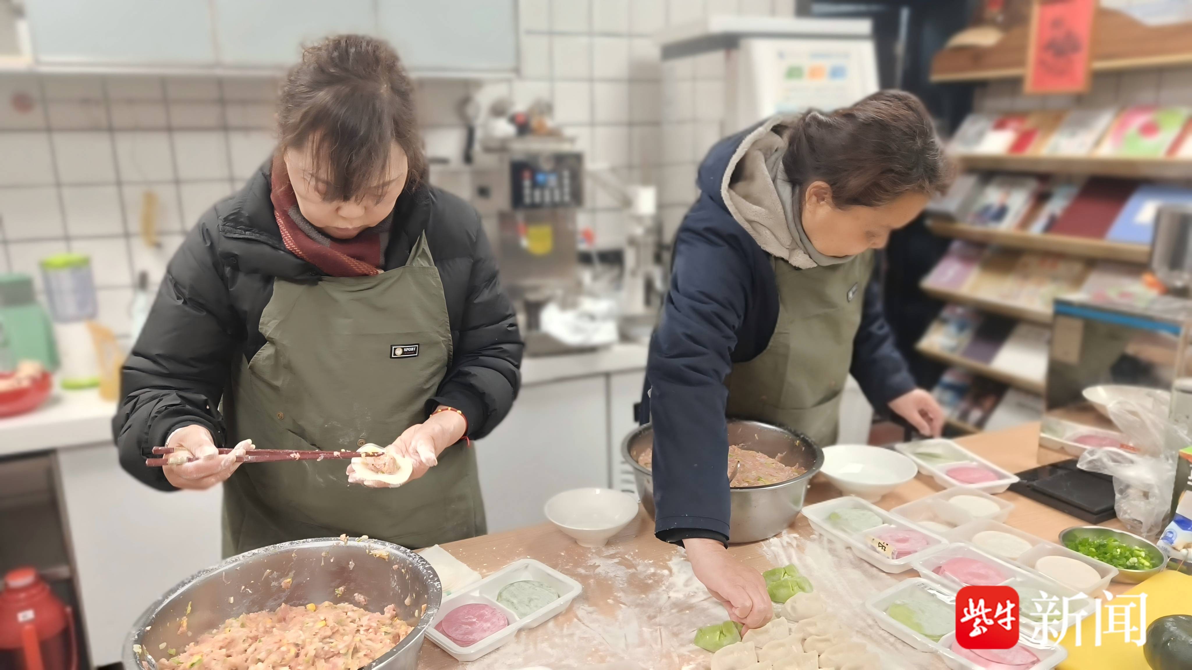 上午9点,“小红梅”邻里厨房内已一派繁忙。志愿者分工协作、配合默契,揉面擀皮、清洗切配、腌制烹饪,有条不紊地为家宴做筹备,元宝形、月牙形,五色皮的饺子快速成型,现场秩序井然。