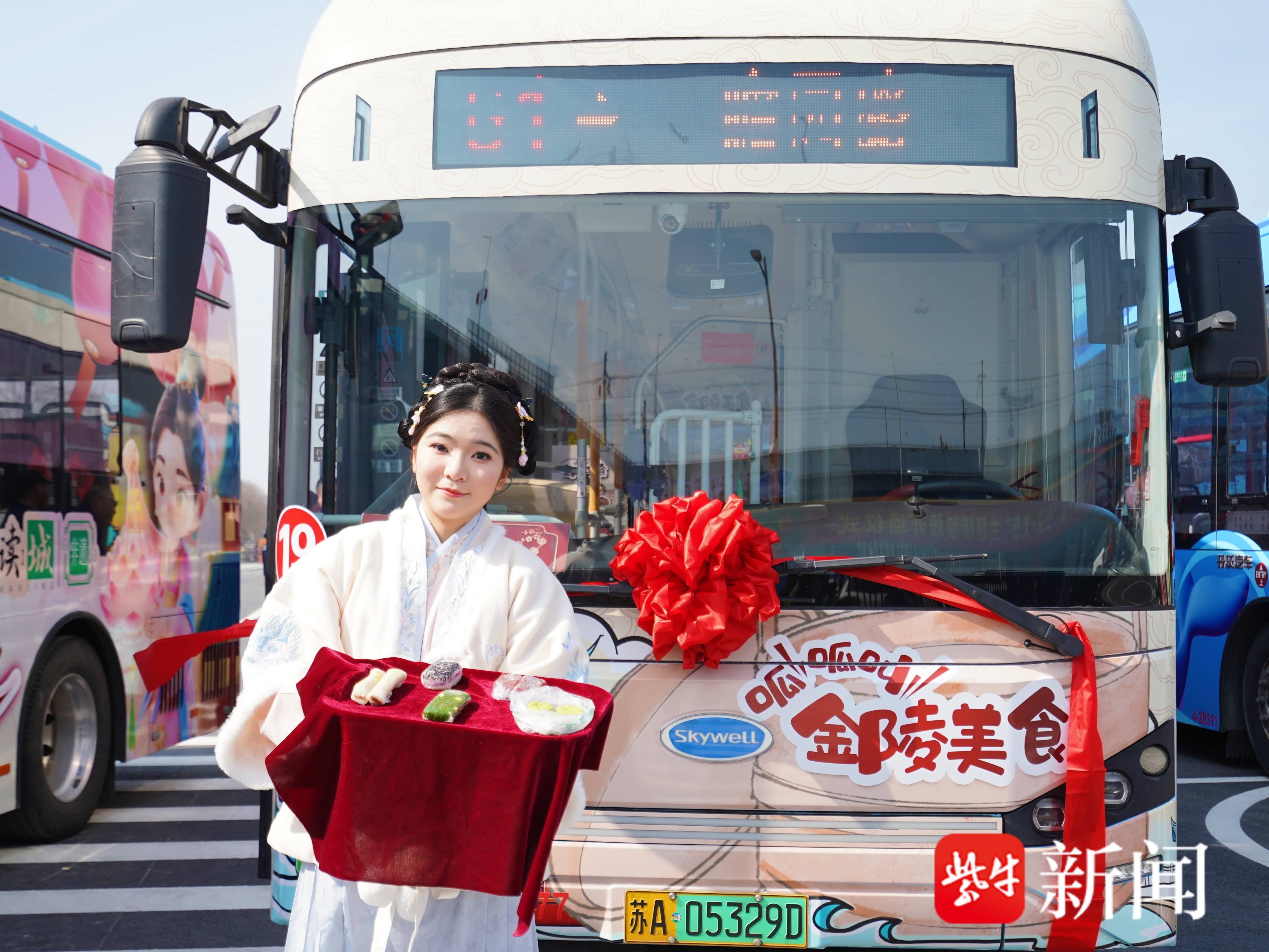 发车现场,没有常见的剪彩和讲话,倒是一场南京白局率先热了场子。非遗腔调一起,围观的市民游客纷纷举起手机。紧接着,“非遗巧韵”“烟火食韵”“文学雅韵”“年节喜韵”四辆主题公交一字排开,几位身着古装的文旅专员站定车门前,笑着招呼大家上车。