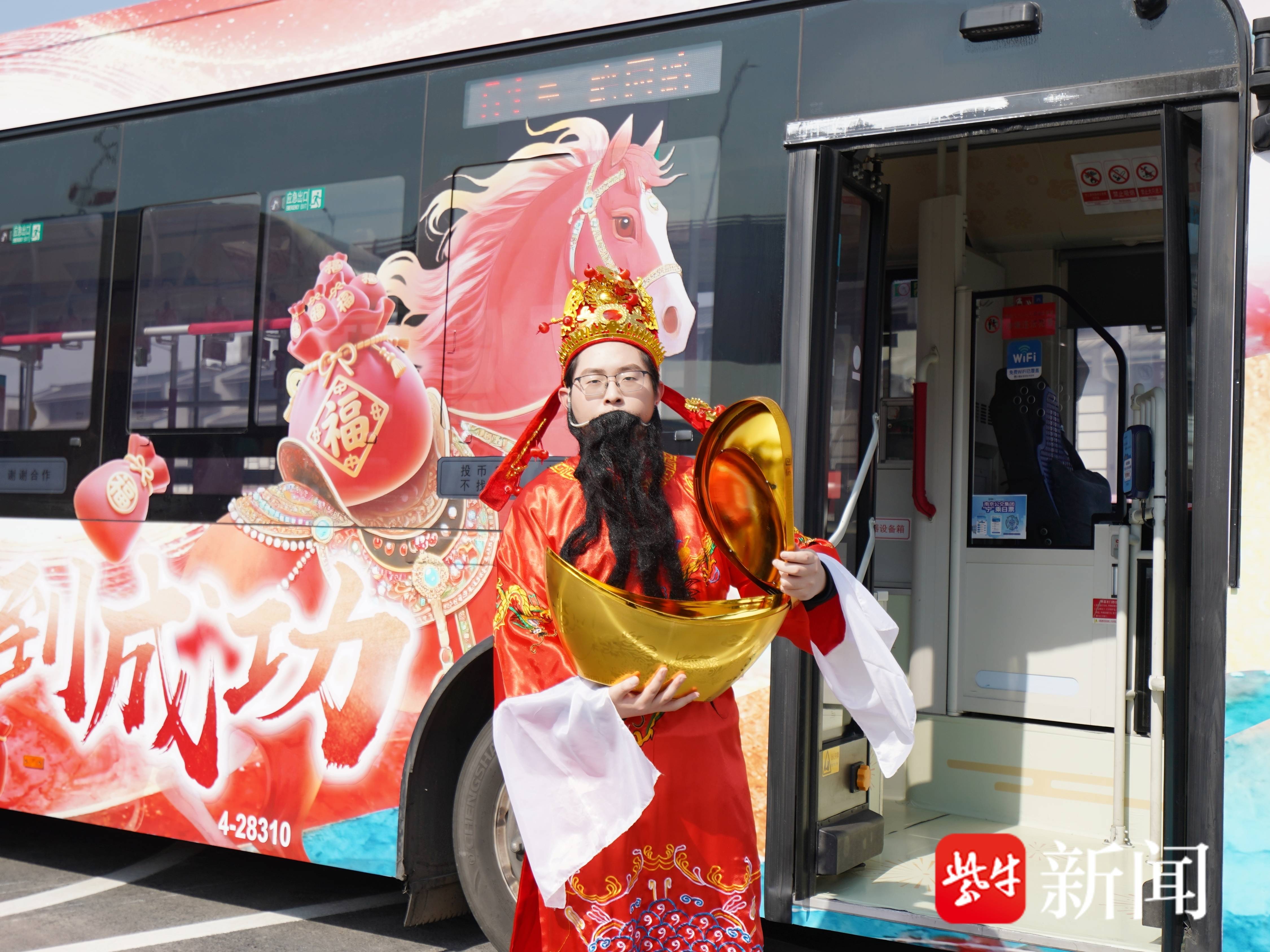 首班车是一辆“年节喜韵·马到成功”主题车,车窗上贴着红火的福字,车厢里挂着秦淮灯彩,一上路就赚足了回头率。