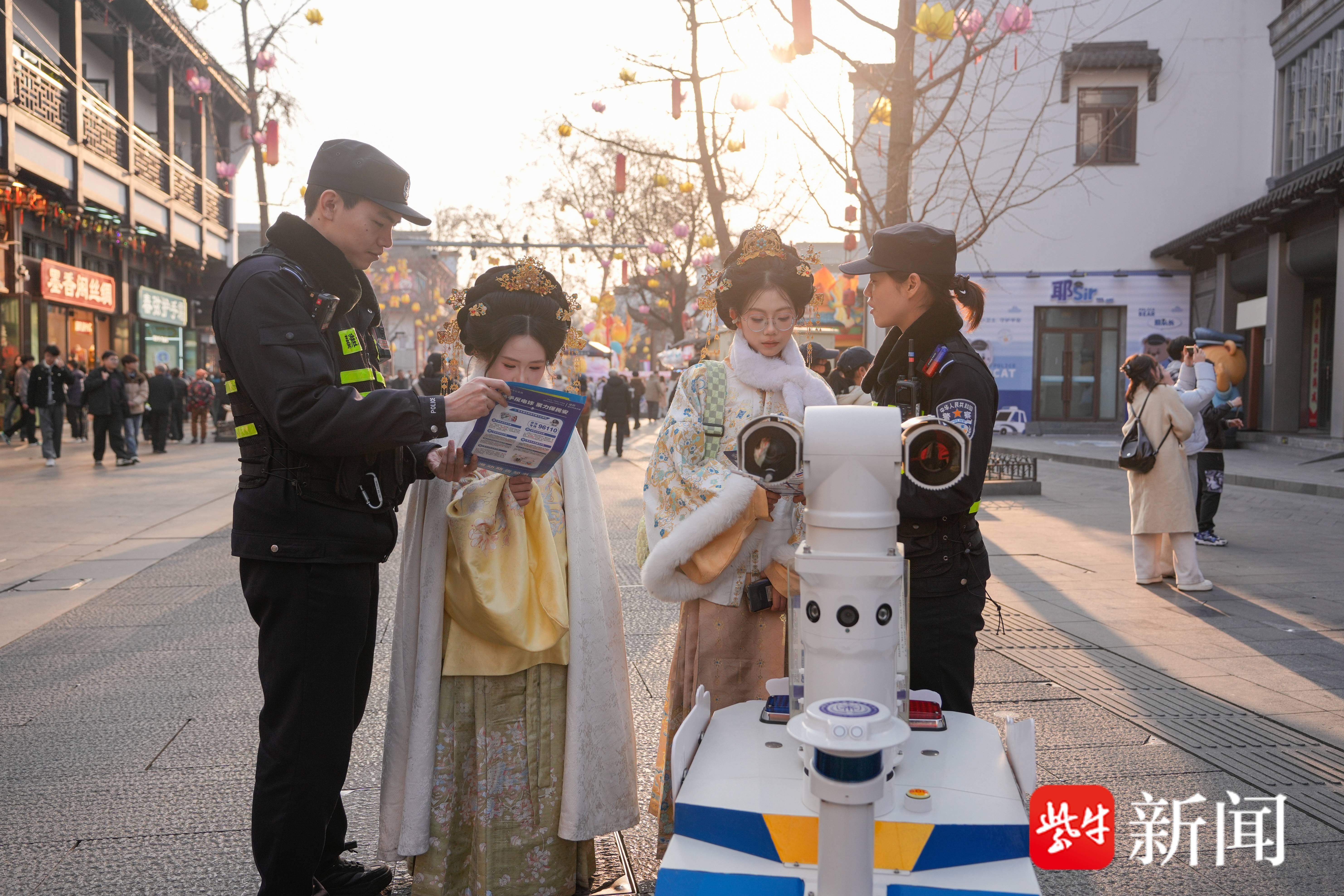 地面各类智能装备各展所长。景区东西牌坊各设置的一台警用多功能移动升降执勤台,成为安保防控的亮眼装备。“它的视野高度能达到4米多,民警站在台上,人流走向、车辆通行都能尽收眼底。”夫子庙派出所副所长马腾说。升级后的智巡机器人“宁宁”配备的摄像头有效弥补了监控视角过大的盲区,还能将摄像头调整到与走失儿童身高相当的位置抓拍。此外,已进驻派出所及游客中心9个月的数字警察“小玥”、智能灯箱、一键报警柱、机器狗、数字战车等智能装备也悉数投入实战,全方位传输现场画面,实现周边警力高效联动,景区热力图阈值预警更实现全覆盖,做到安全风险早发现、早预警、早处置。