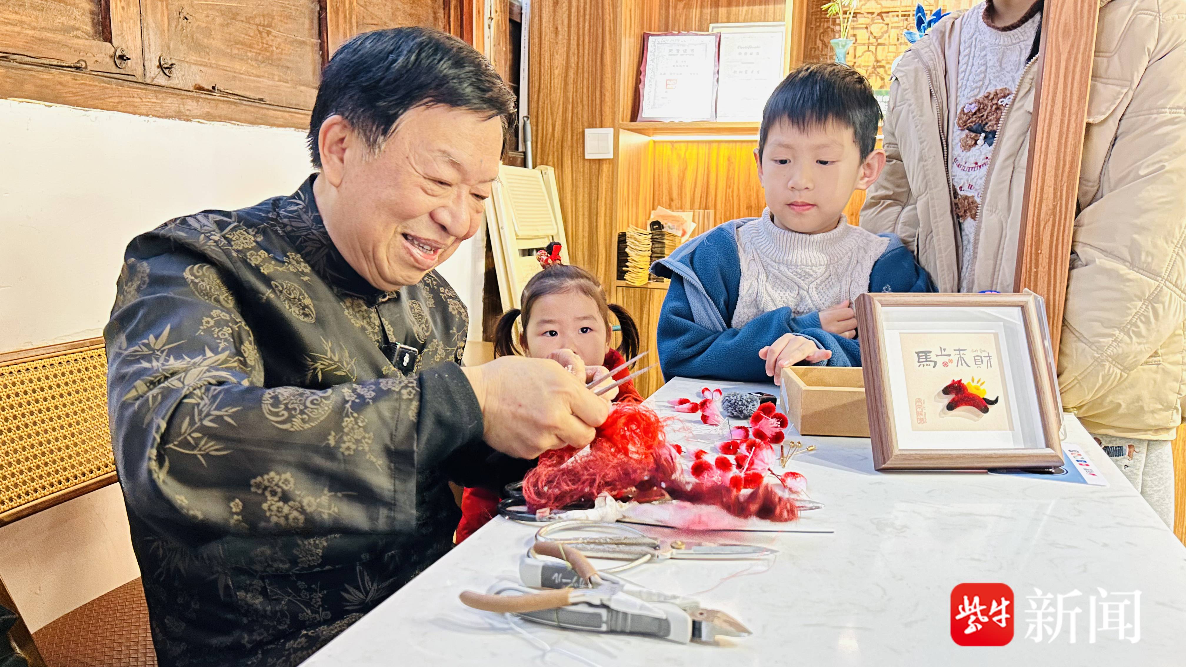 走进老门东非遗传习馆,江苏省非物质文化遗产“绒花制作技艺”代表性传承人赵树宪的桌前围满了游客。勾条、打尖、传花……短短数道工序,普通的蚕丝、铜条就在他手中化作一朵朵精巧灵动的绒花。今年马年新春,赵树宪团队专门设计了两款马主题文创作品,“这款叫‘马上青松’,祝愿大家新的一年张弛有度、奋发向上;这款‘马上来财’,寄托了大家对美好生活的期许。”现场游客纷纷感叹,绒花花瓣优美的弧度与恰到好处的绒毛栩栩如生,仿佛真花绽放在眼前。