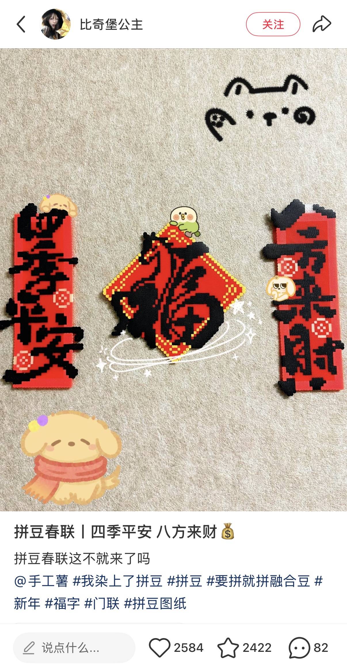 拼豆春联不仅是一件手工作品,还成为了年轻人的社交纽带。在社交平台上,大家纷纷晒出自己的拼豆作品,交流配色技巧,分享创意模板。对于不少“社恐”年轻人来说,不用刻意寒暄,一幅精心制作的拼豆春联,就能得到同好的认可,传递节日祝福。