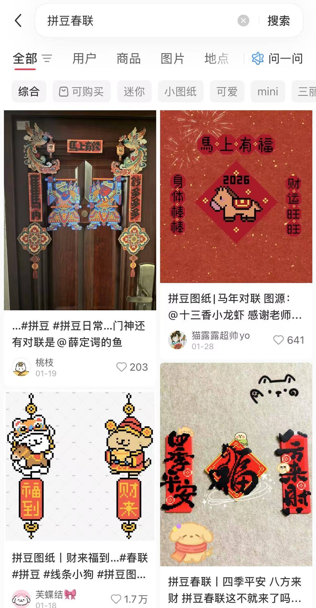 今年1月,拼豆爱好者“十三香小龙虾”在小红书分享了一套马年主题的拼豆春联图纸:上联“财运旺旺”,下联“身体棒棒”,横批“马上有福”,中间一匹卡通小马,既贴合马年氛围,又灵动可爱,帖子很快收获超一万个点赞。