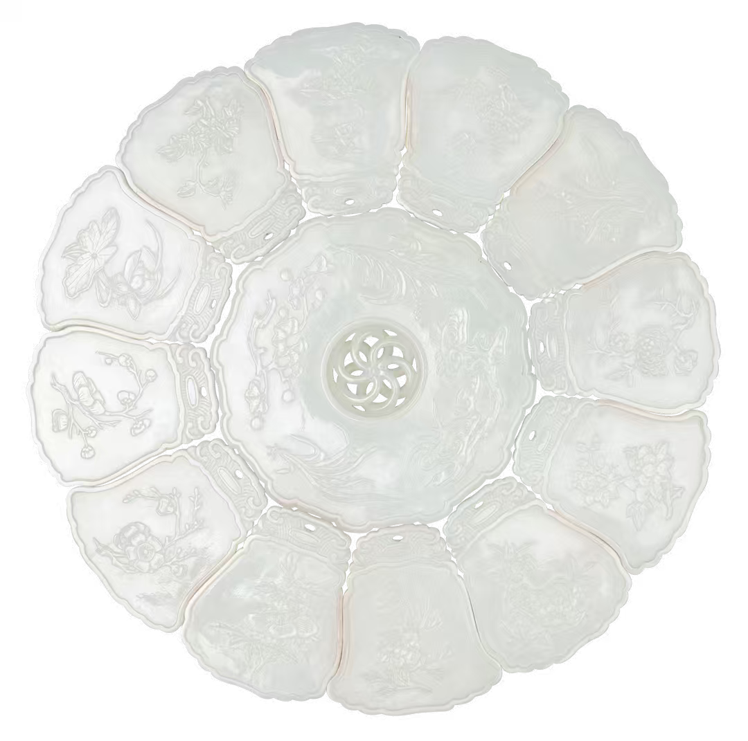 要说马年春晚哪个节目视觉效果最为惊艳,一定会有不少观众会给《贺花神》投上一票,秦岚、王楚然、李沁、唐诗逸、李云霄等艺人的古装扮相惊艳大众。《贺花神》的文物灵感是故宫博物院馆藏的清代白玉月令组佩,这件展品在故宫博物院斋宫展厅“玉出昆冈——清代宫廷和田玉文化特展”中展出,是此次特展的代表性展品。这套玉佩以整块和田白玉雕琢而成,套共十三件,聚可成组,分可独立成意,是清代玉雕技艺的集大成之作,花蕊一面雕水仙、海棠、万年青、灵芝图案;另一面雕阳文篆书十二音律,分别为黄钟、大吕、泰(太)蔟、夹钟、姑洗、仲吕、蕤宾、林钟、彝(夷)则、南吕、无射、应钟。十二月令与十二音律之间的对应关系是对中华传统文化的生动阐释,也是人与自然之间和谐关系的体现。