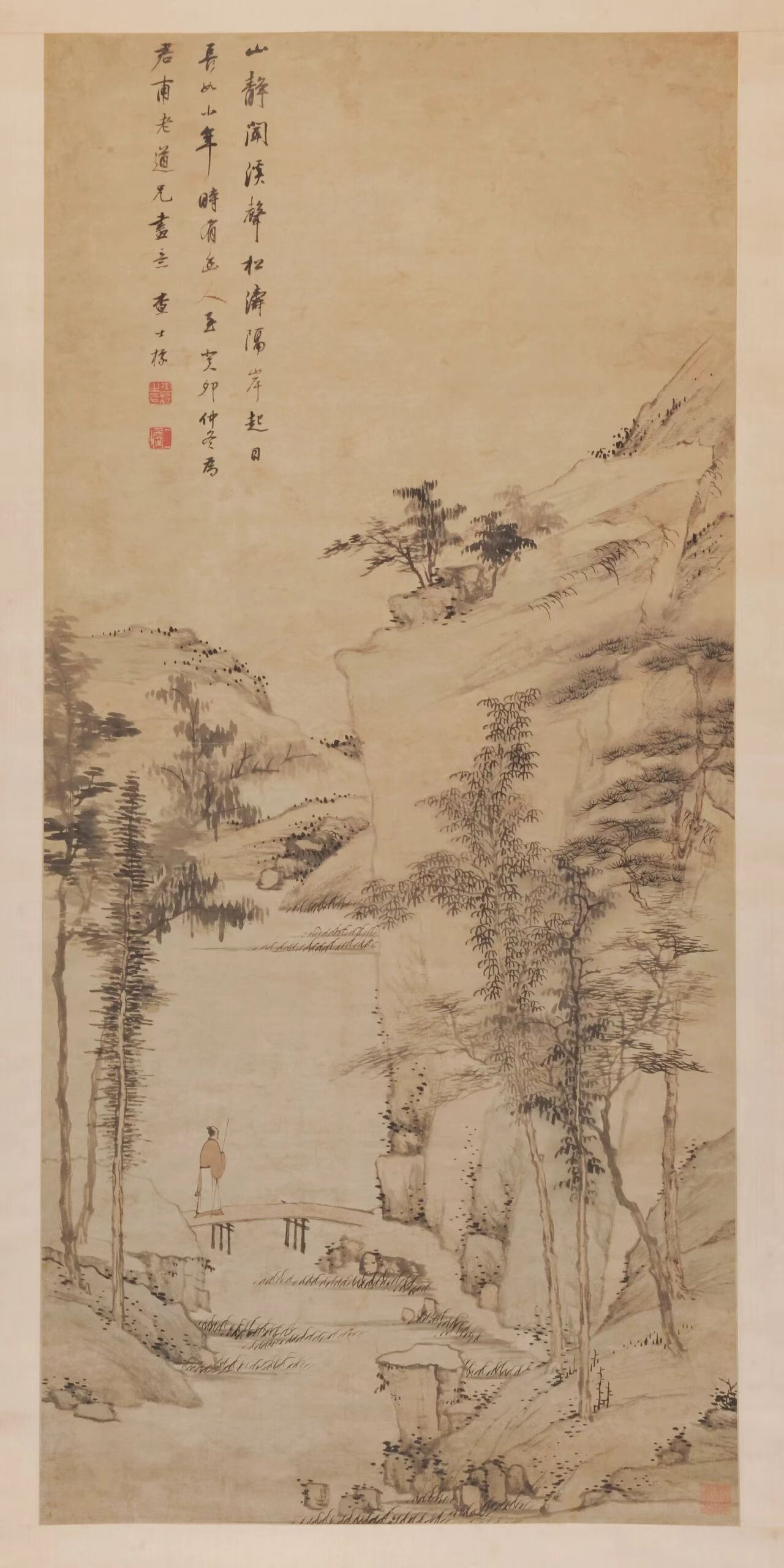 作为新安画派代表性画家和旗帜性人物,查士标与释弘仁、孙逸、汪之瑞并称“新安四家”。出现在春晚舞台上的《曳杖过桥图》上绘一束髻红袍高士,曳杖立于桥上,静望远山,画面雅致疏朗,这是查士标早期代表作之一。