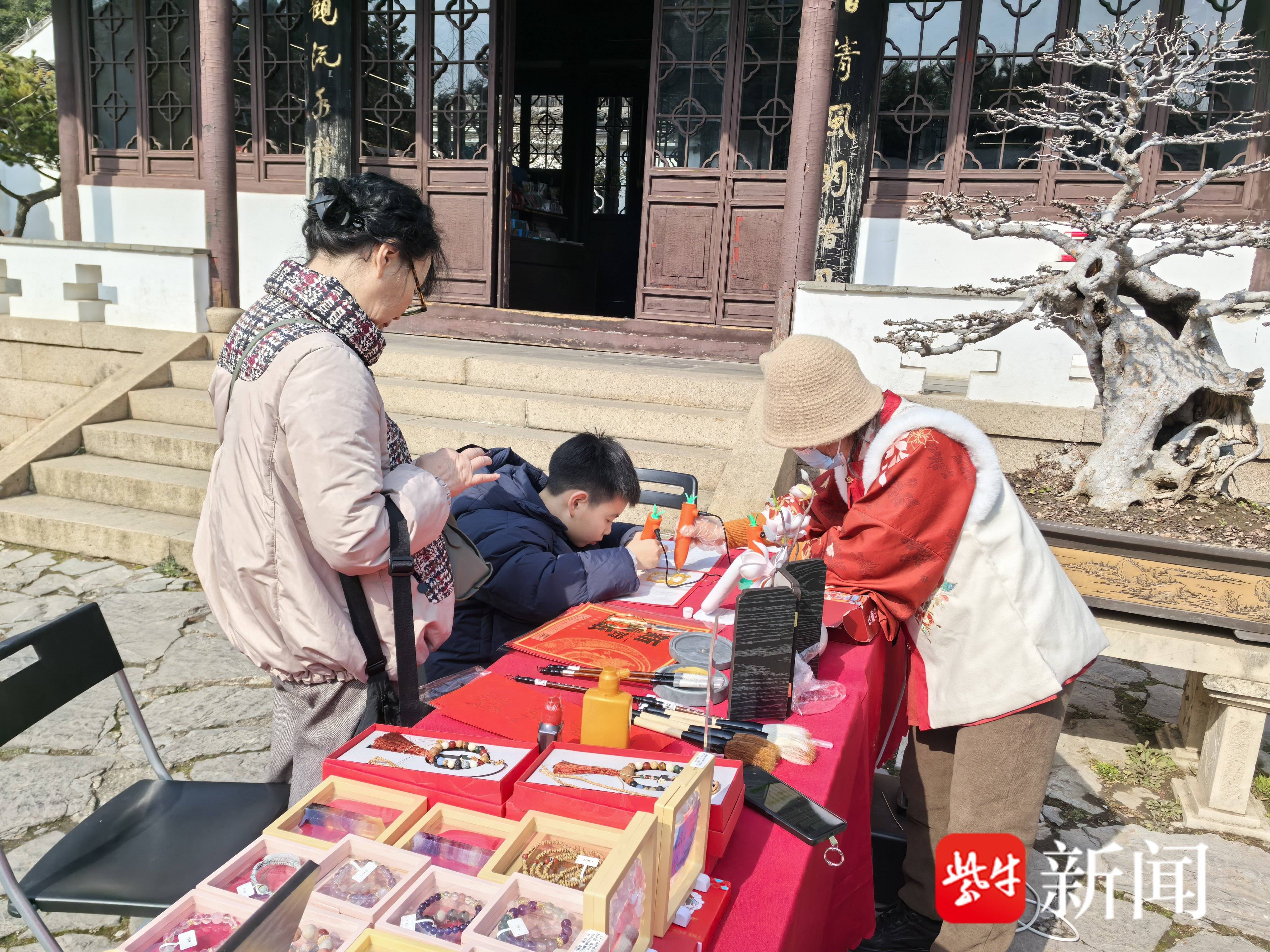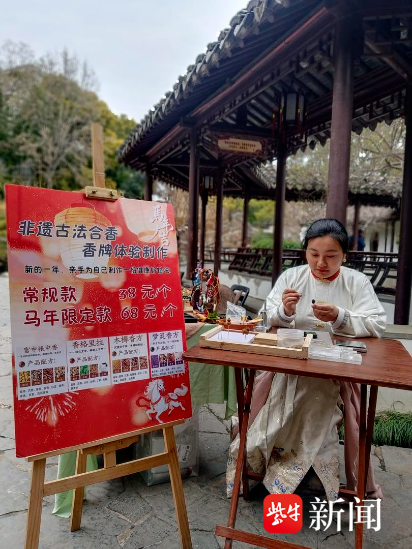 新春假期期间瞻园还推出了古风情景互动市集,在工作人员的带领下,化子们体验非遗手作,大人们也能够买非遗古法合香等新年好物,感受金陵上元新春的热闹与雅致。