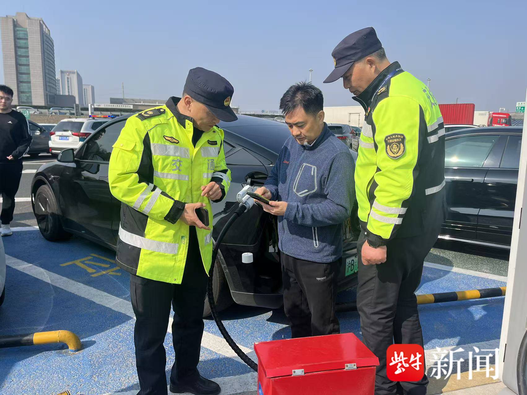 宁通支队第六大队“护您通畅”服务队迅速启动“跨区充电”疏导机制,安排专人引导车辆通过服务区下穿通道前往北侧充电站。当日,245辆新能源车被成功疏导至北侧充电,南北两侧累计服务充电车辆达900余辆次。