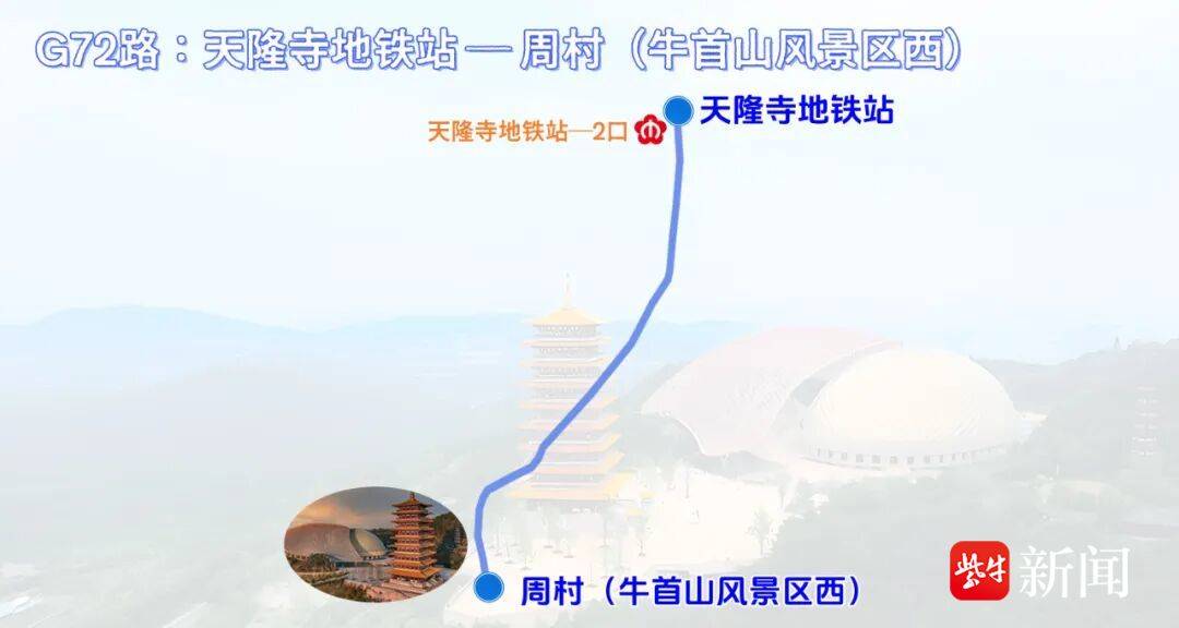 G72路是衔接地铁与核心景区的“快捷专线”,自天隆寺地铁站(地铁1号线)至周村(牛首山风景区西),途经居民密集区域,与地铁“零距离”换乘。线路服务时间与景区开放时段精准同步,还会根据实时客流灵活调整班次间隔。春节期间,景区增设免费接驳车,搭配G72路免费福利,为游客提供“门到门”便捷体验。运营时间为07:30 - 17:00天隆寺地铁站、08:15 - 17:45周村(牛首山风景区西)(牛首山景区西)。