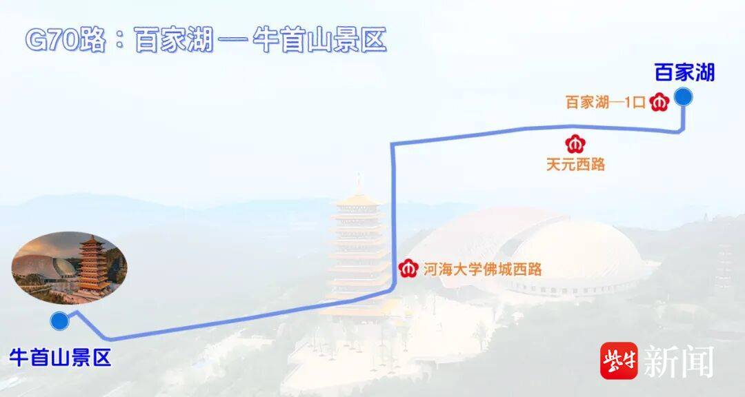 据了解,G70路主打“山水人文联动”,往返百家湖与牛首山景区,串联百家湖地铁站(地铁1号线)、天元西路地铁站(地铁3号线)、河海大学江宁校区等核心节点,实现地铁与景区无缝衔接。运营时间为7:45-17:00百家湖、8:30-17:40牛首山景区。