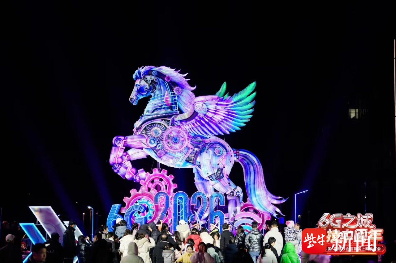 暮色渐浓,江宁的夜晚“五彩斑斓”,年味氤氲在烟花与灯会里。在汤山百联奥特莱斯,绚丽的烟花在空中陆续“绽放”,空中的烟花倒映在广场湖面上,湖面顿时变成了一个巨大的“烟花舞台”。而在“6G之城 科技中国年”第40届秦淮灯会暨首届上秦淮灯会现场,“赛博飞马”“科技之门”等数十组融合6G科技与民俗元素的灯组“流光溢彩”,齿轮、芯片、机械羽翼、机器人等元素融入灯组,科技元素结合传统生肖文化让年味有了新表达。
