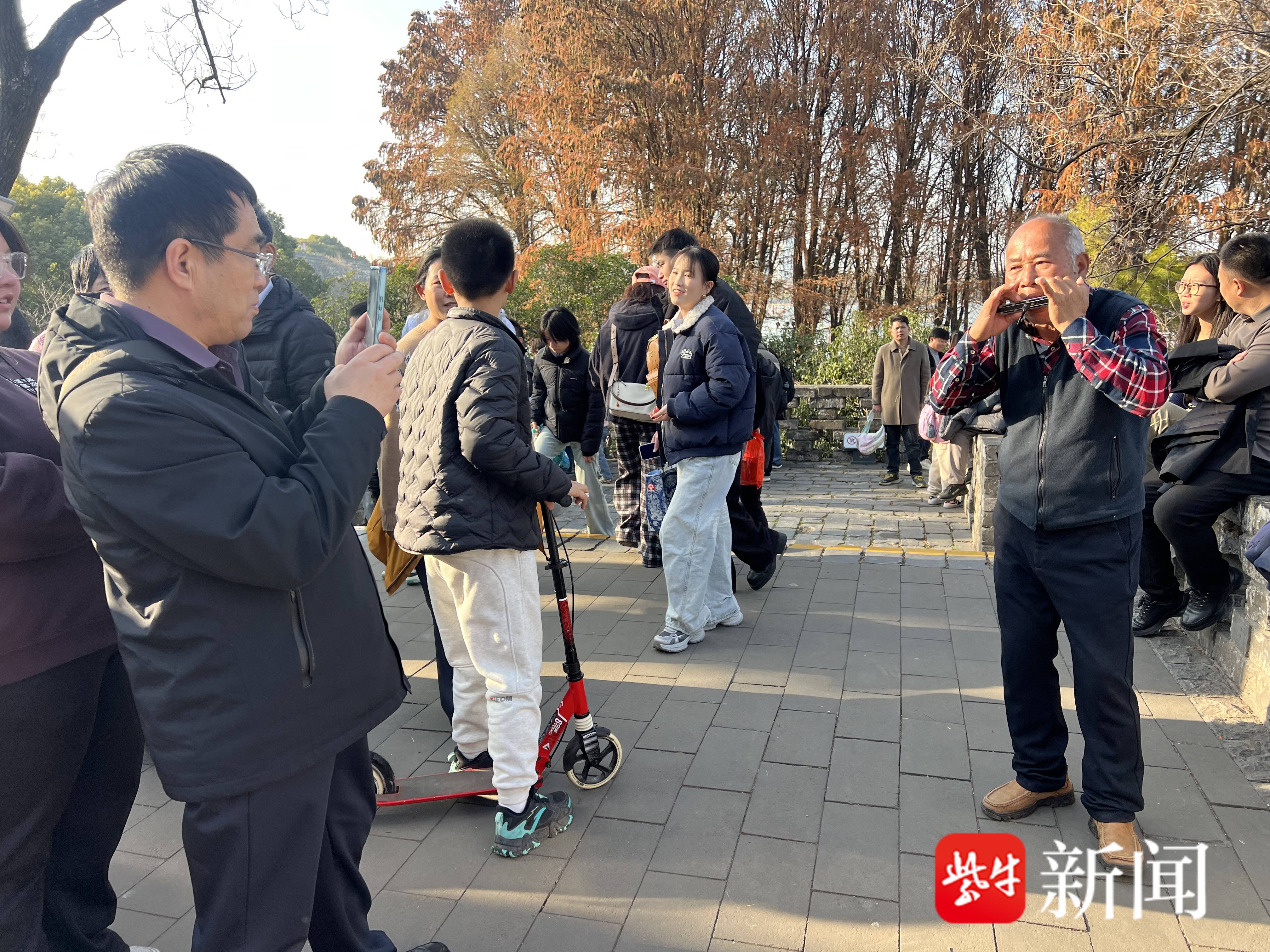 在玄武湖菱洲,一位市民用口琴吹奏《一剪梅》,动听的旋律吸引游客驻足聆听。