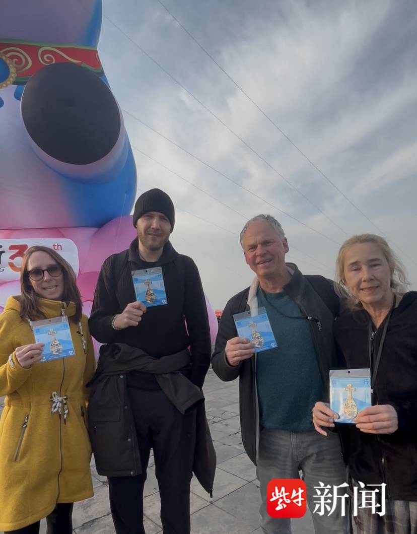 欧洲旅游团的客人们拿着南京地标冰箱贴,非常开心。