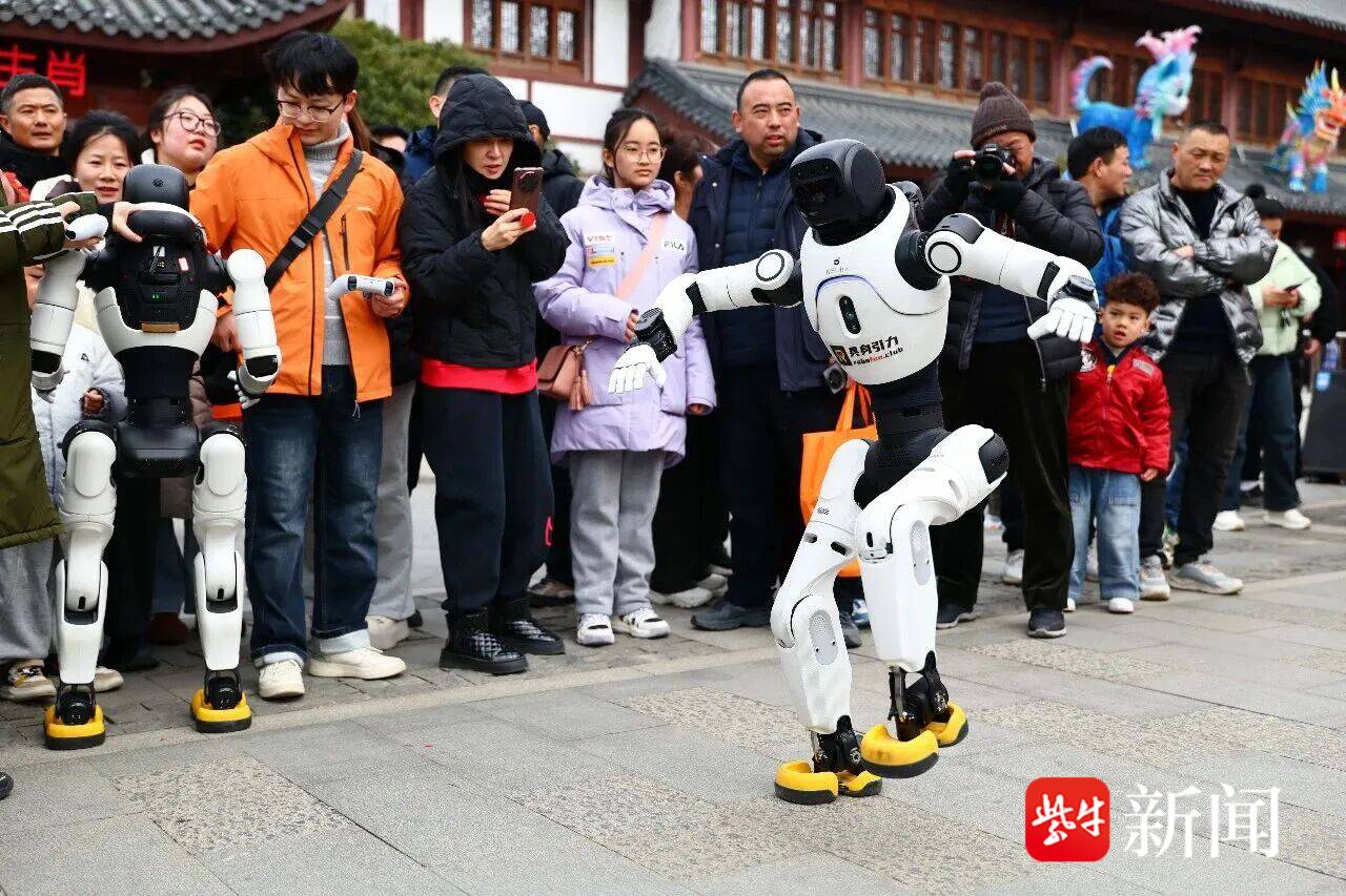 当天,别开生面的机器人表演吸引着众多游客驻足。在互动广场上,机器狗时而翻腾跳跃、憨态可掬,人形机器人则拱手作揖、朗声送上马年吉祥祝语,新潮科技与传统年味奇妙碰撞,引得现场欢笑声、喝彩声接连不断。