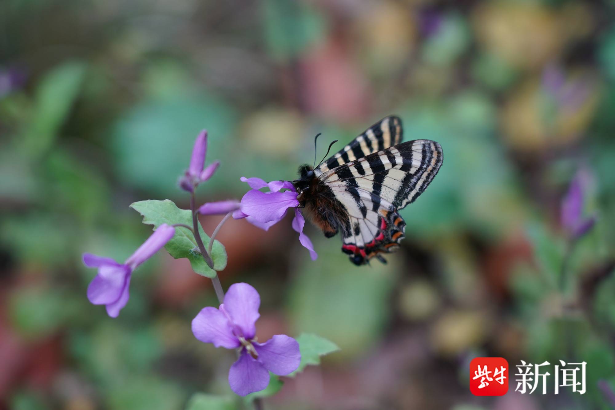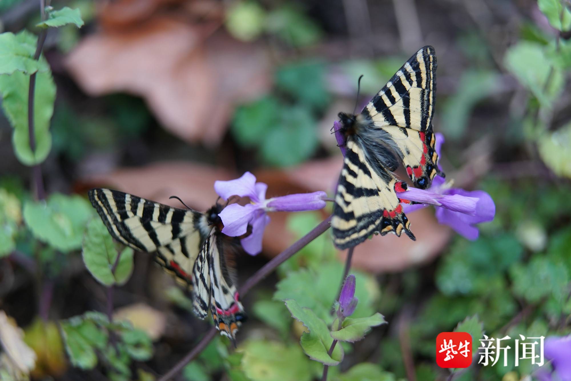 中华虎凤蝶老山林中比较稀少,难得一见。在半山腰的林间,两只黑色与黄色相间形似老虎纹的蝴蝶,正在二月兰花丛中翩翩起舞。这些飞舞在浦口老山里的小精灵,竟然提前出现了。