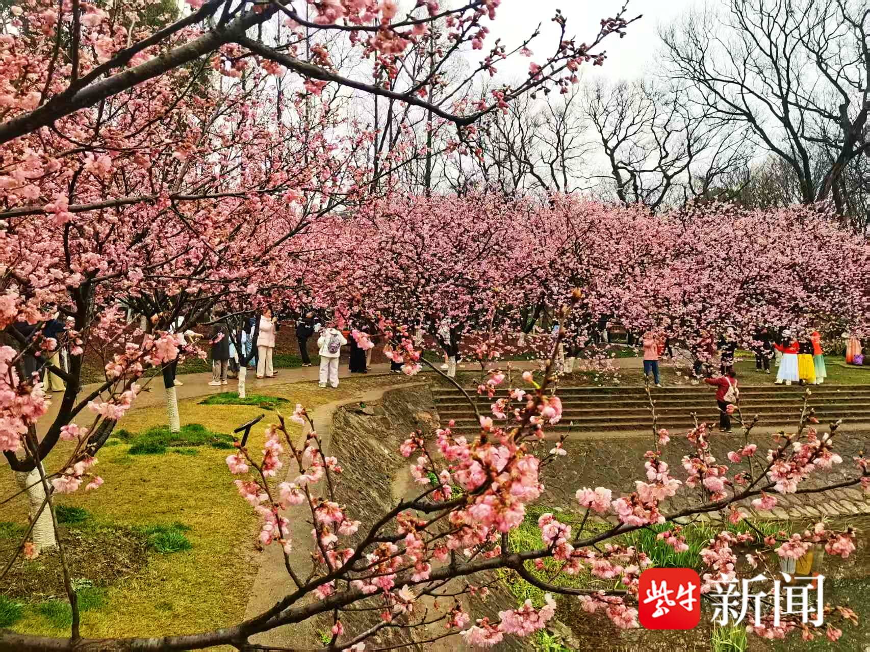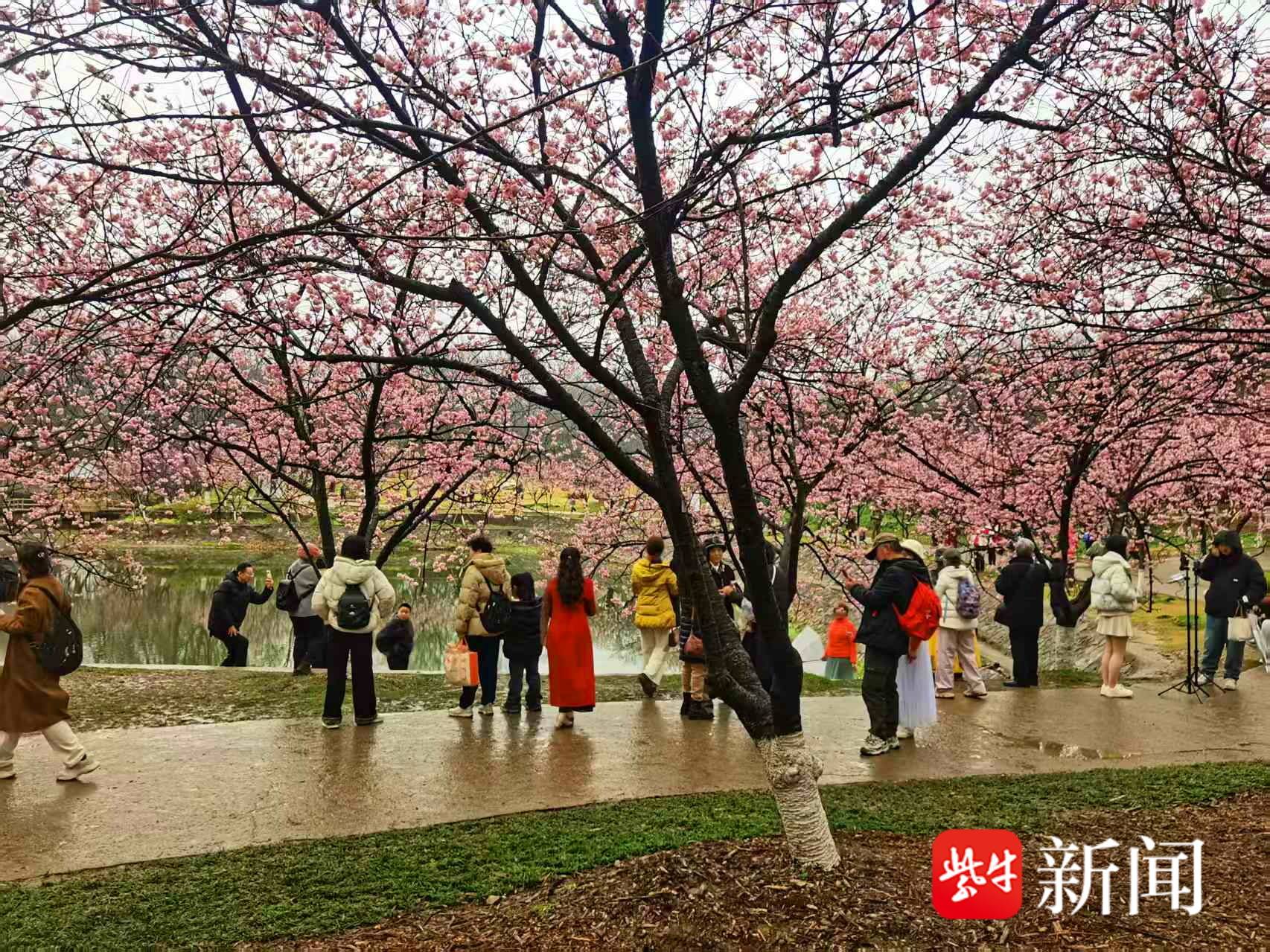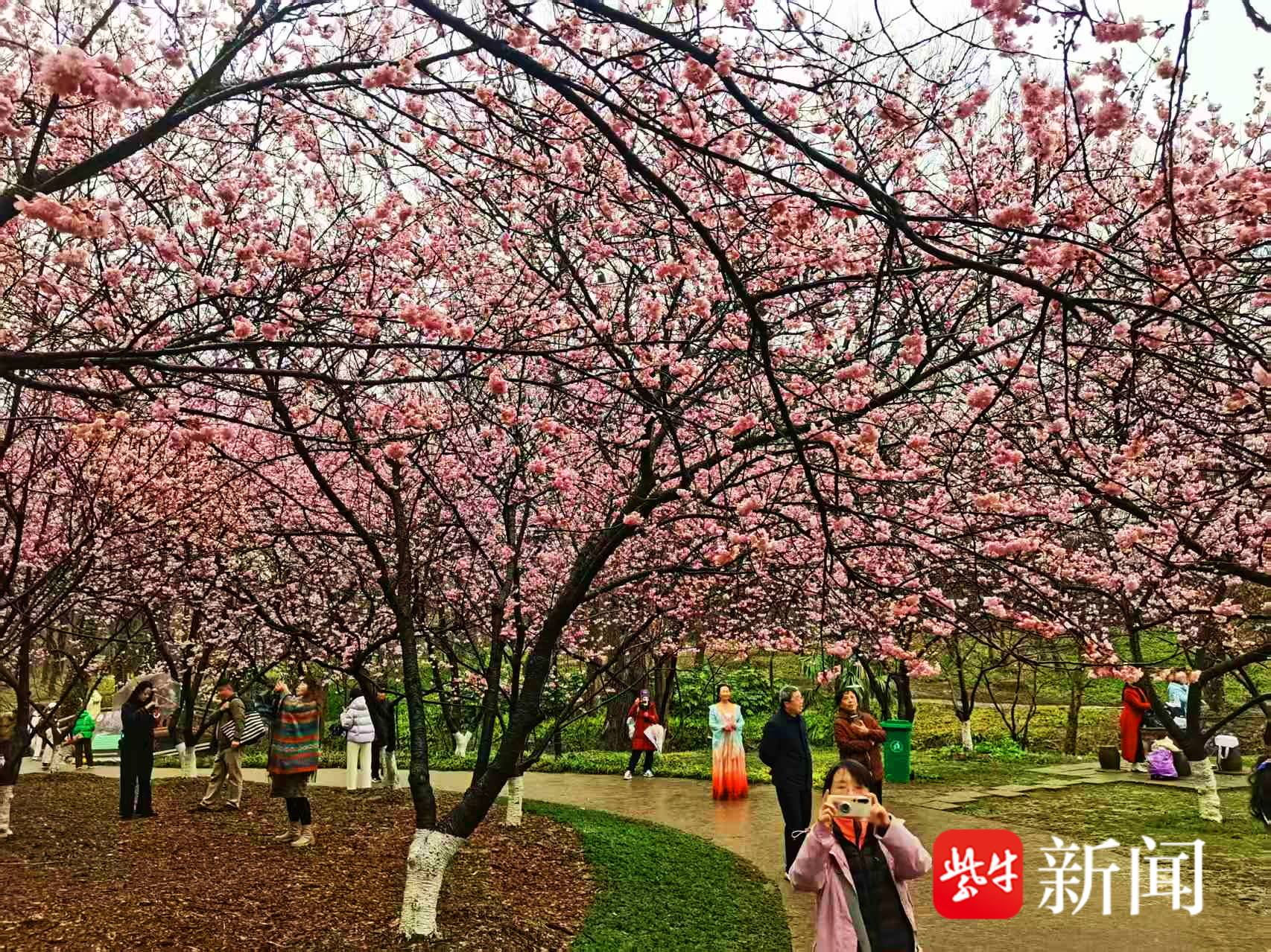 在南京中山植物园北园的樱花大道上,椿寒樱已全部盛开,进入了最佳观赏期,并因此吸引了大量游客前来观赏、打卡。