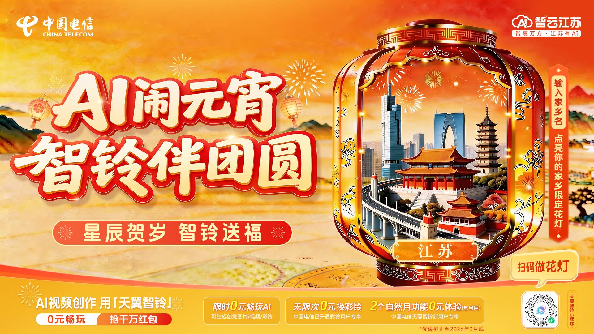 马年启新章,元宵添喜乐!中国电信天翼智铃正以AI之力焕新通信体验,惠及江苏用户,为“智云江苏”建设添彩赋能。恰逢元宵佳节、马年新始,即刻解锁天翼智铃,开启你的专属创意之旅,让每一次来电,都成为一场创意展示,让每一次等待,都充满惊喜与美好,在新的一年,让每一通来电都有专属精彩!