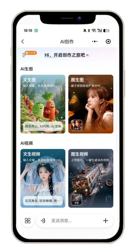 AI视频,让想象照进现实:输入一句文案,文生视频即刻生成你的专属创意短片;上传一张图片,图生视频让静态瞬间秒变动态故事。双图互动会智能提取两张图片中的人物或场景,无缝融合生成全新视频。首尾图生成更是让AI化身“神笔马良”,只需上传开头与结尾画面,AI便能智能补齐中间的变化过程,让故事的流转自然又精彩,轻松打造有情节、有画面的视频。让想象力不再受限。