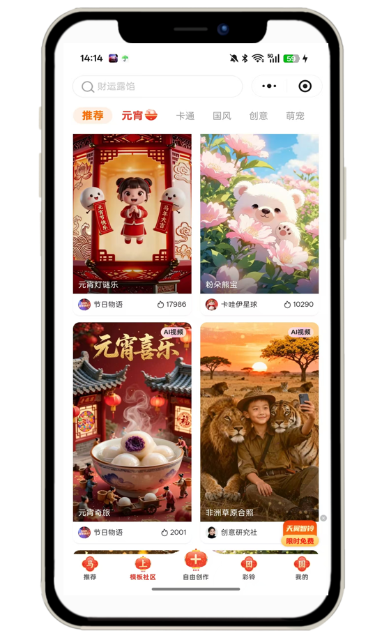 微信搜索并打开“天翼智铃”小程序,海量模板库任你挑选:国潮风韵、萌宠治愈、卡通趣味……风格百变,总有一款击中你的“心巴”。马年专属、元宵主题创意模板更是氛围感拉满。一键复制模板即可快速使用,也能随心修改文案,轻松打造贴合节日氛围的专属彩铃,让来电等待瞬间充满新春元宵的喜庆气息,创作门槛一降再降,人人都能轻松上手!