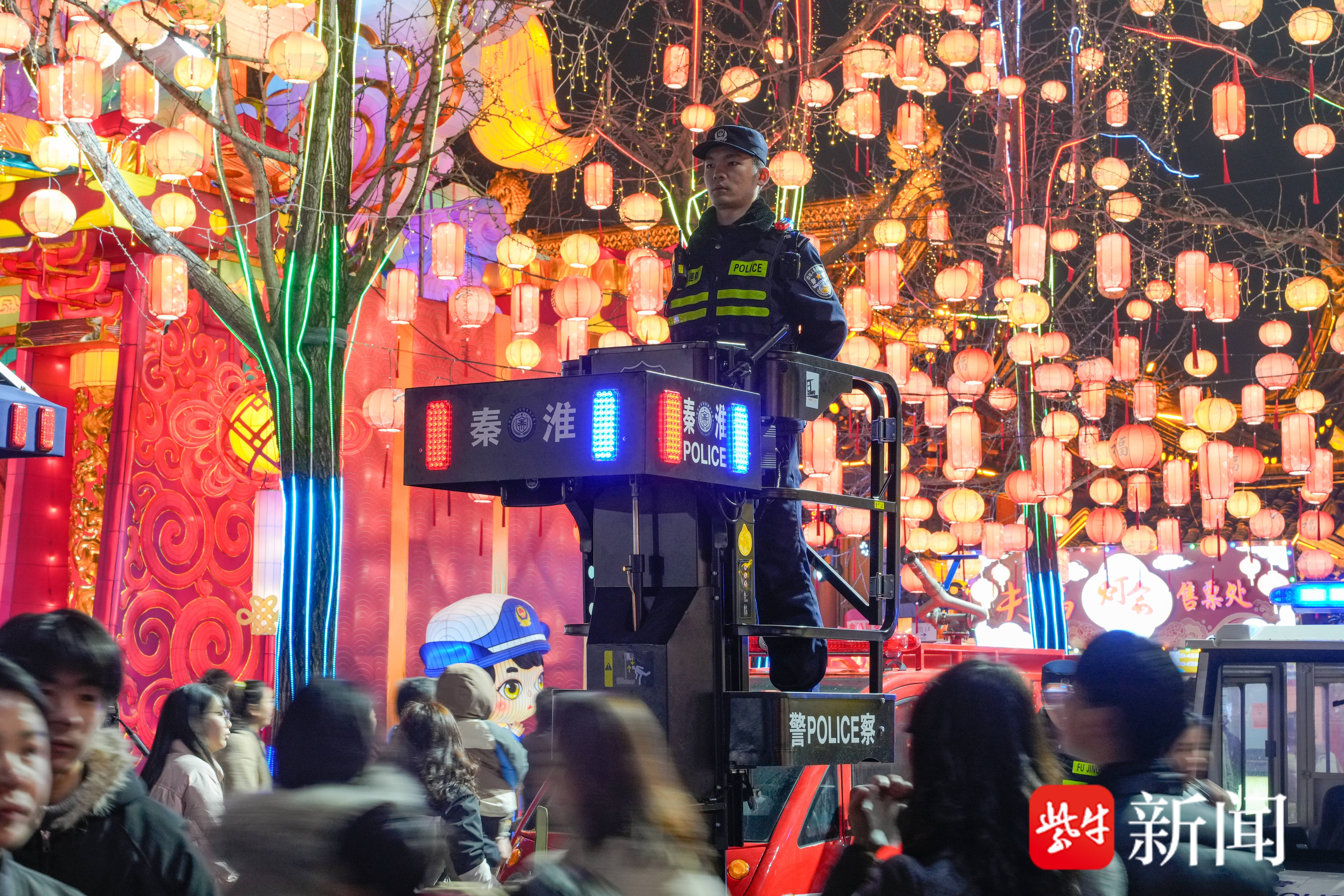 傍晚6时许,天色渐暗,夫子庙东牌坊的“二龙戏珠”巨型灯组准时亮起,景区客流量开始攀升。在入口处,预约赏灯的游客络绎不绝,高达6米的警用多功能升降台再次投入工作,“请有序排队,照看好身边的老人和小孩……”秦淮分局民警手持喊话器做好客流指引。
