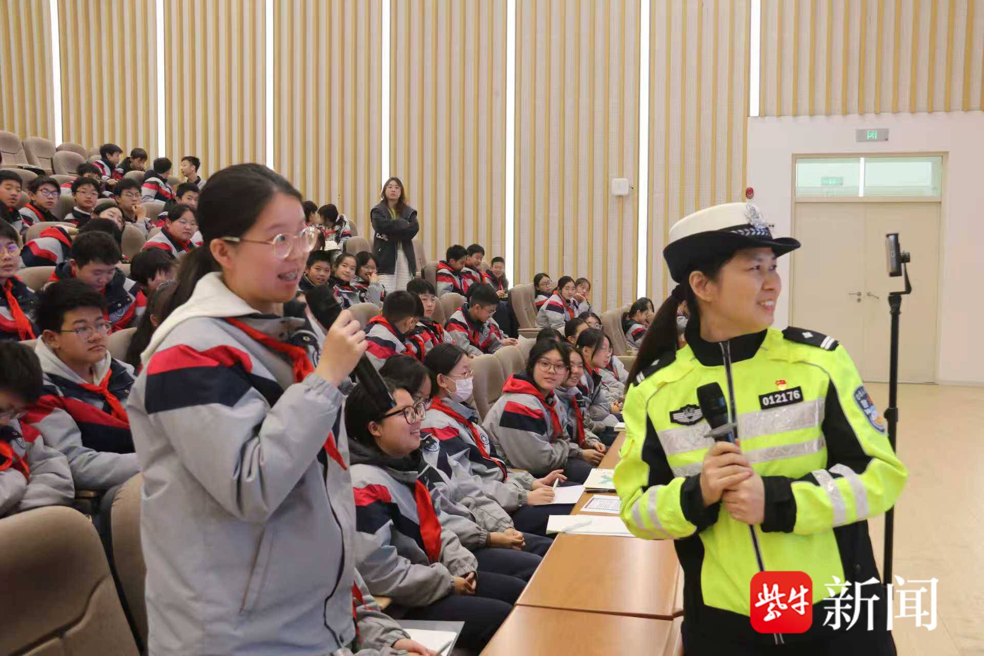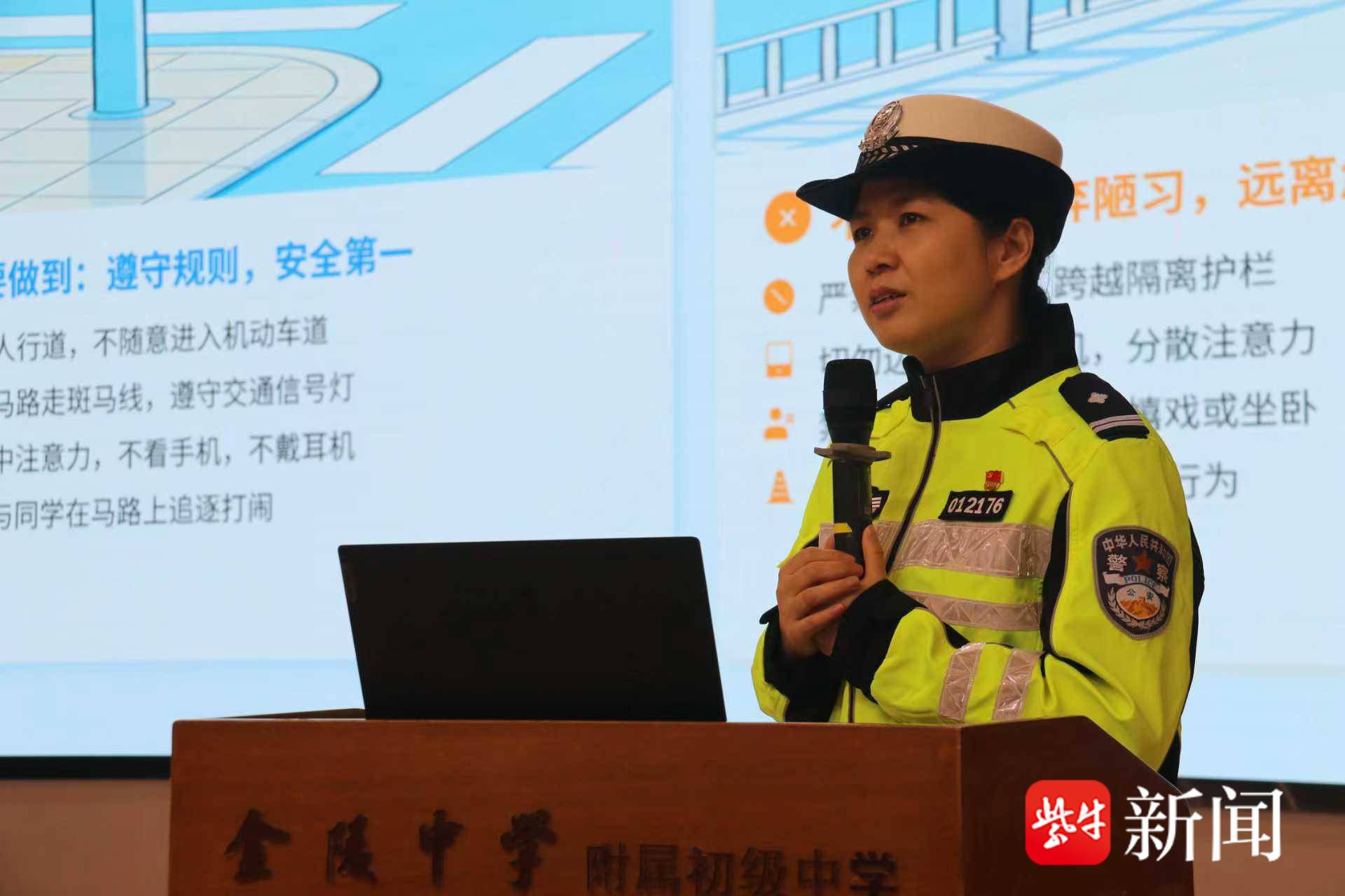 新学期第一天,南京交警建邺区大队主动深入辖区的金陵中学江心洲分校,有针对性的为同学们带来了一场别开生面的交通安全主题“小课堂”,提醒同学们不随意进入机动车道,过街要走人行道,不低头看手机、不戴耳机、不追逐打闹,切实增强学生群体的交通安全意识。