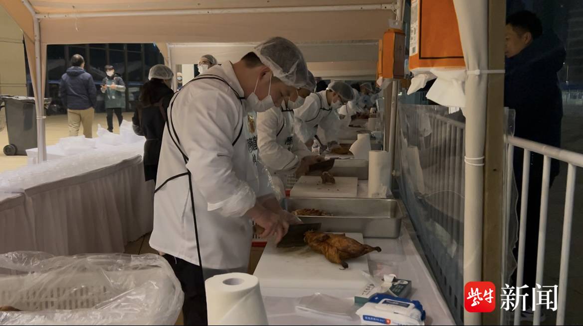 “这是我们星甸烤鸭!”一名工作人员一边剁鸭子一边告诉记者,18名专门负责“zan鸭子”的工作人员凌晨3点就到场了,每人预计要剁100只鸭子,让跑者们冲线后可以第一时间品尝到江北特产。