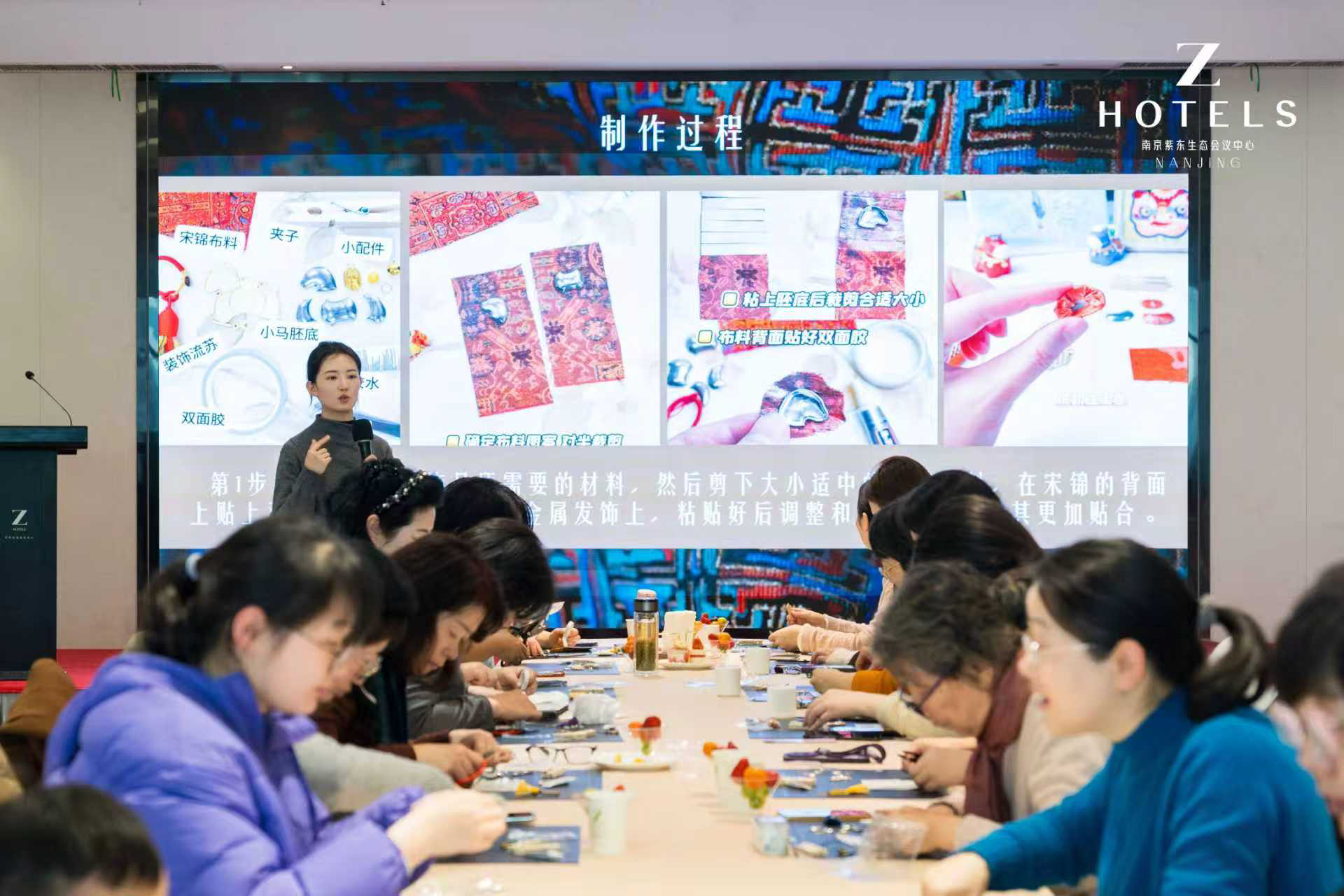 栖霞区“凡石美术”专业指导老师现场细致讲解宋锦挂件制作、配色等工艺要点,从裁剪到拼接成型分步示范教学。女职工们在手工创作中感受乐趣,体悟非遗的匠心精髓。