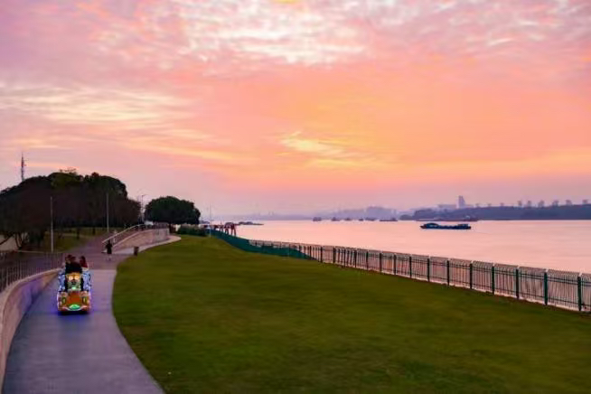如今的笆斗山,早已伴着春日暖阳,成为南京市民休闲放松的宝藏去处。从地铁1号线笆斗山站出站,沿着滨江步道漫行,春草铺就的绿毯沿江舒展,江风裹着草木的清香扑面而来。晴好的傍晚,这里的“橘子海”落日更是春日限定的浪漫。往来货船穿行在粼粼波光里,所有喧嚣都被温柔的春风吹散。