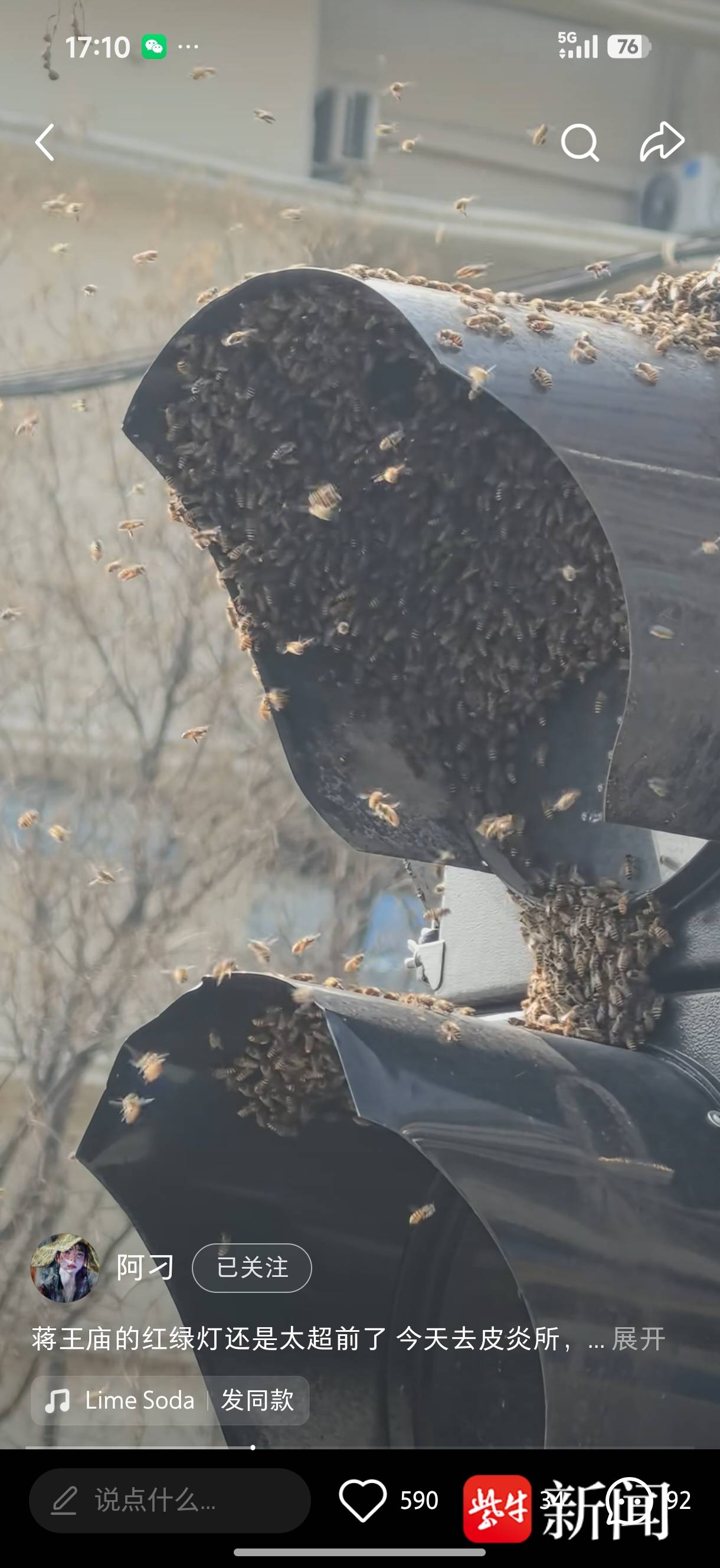 网友拍下蜜蜂“占领”红绿灯 记者探访发现已有部门介入清理 园林部门回应:或因花开季节蜜源吸引