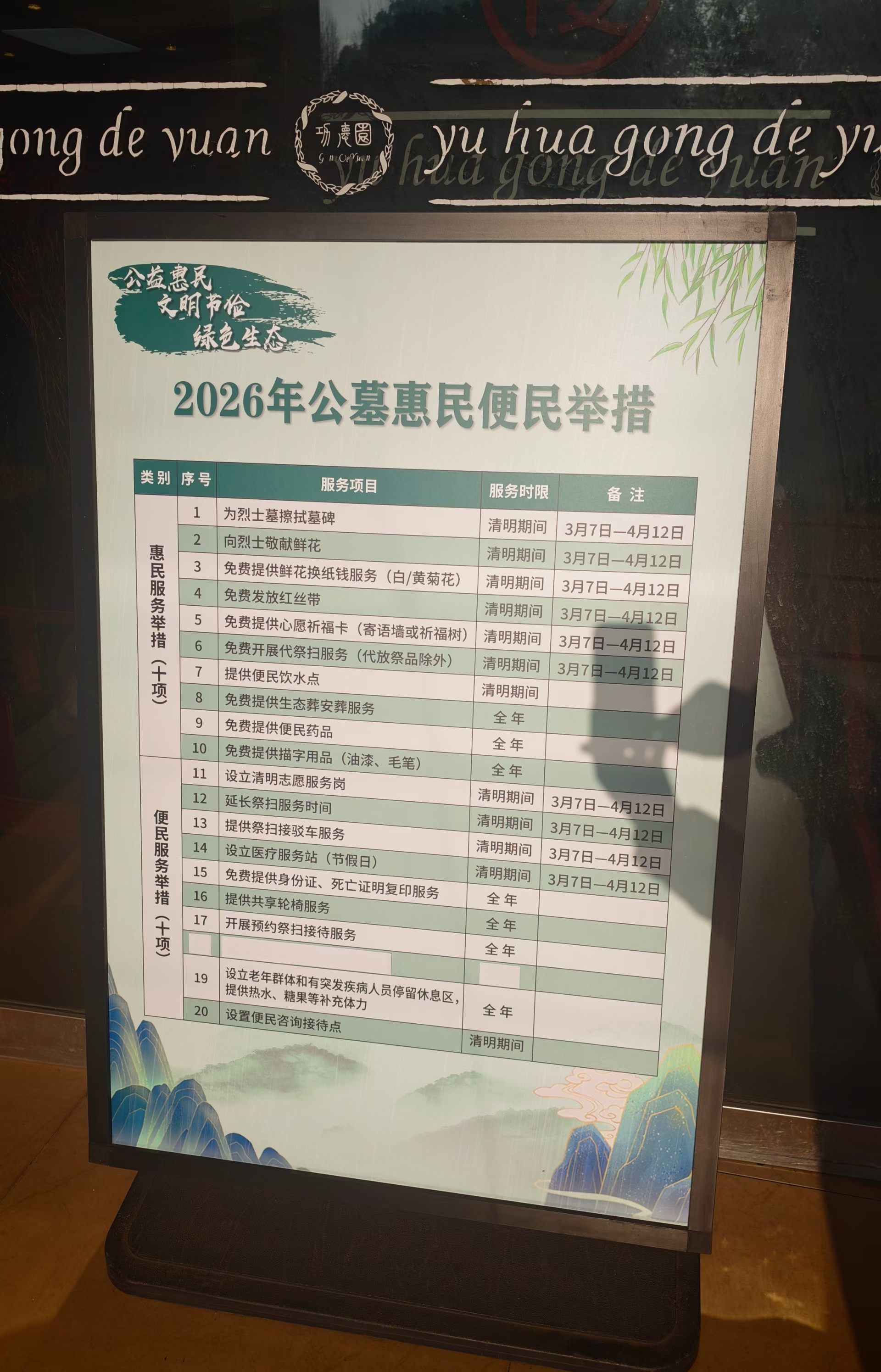 10时10分,普觉寺墓园的人流渐入高峰。记者在现场看到,人流络绎不绝,却井然有序。工作人员穿梭在人群中,一边引导车辆,一边提醒市民注意安全。在墓园服务中心的展板前,78岁的陈先生仔细阅读着2026年公墓惠民便民举措。他竖着大拇指对记者说:“鲜花换纸钱、园内免费接驳车等,都是实实在在的利好。”