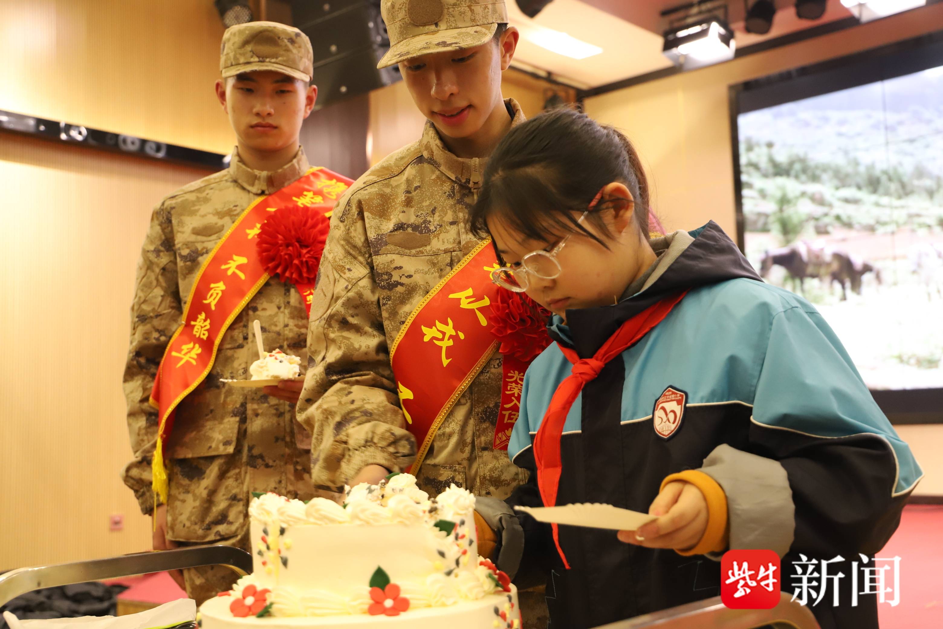 当晚8时50分,新兵们整齐列队步入军供站,在奔赴下一站前进行短暂休整。军供站播放了军旅励志和南京双拥工作介绍的宣传短片,8分钟的影像让年轻战士们提前感受军营氛围。随后举行的集体生日仪式成为当晚最温馨的环节。南京军供站提前梳理了3月份过生日的新兵名单,为他们和所有开启军旅新篇章的年轻战士精心准备了一场入伍集体生日会。小朋友们手捧鲜花走向过生日的新兵,送上童真的祝福。在欢快的生日歌声中,蛋糕被分到每一位战士手中。与此同时,新兵们还收到了一封特殊的信——《南京军供站致新兵的一封信》。